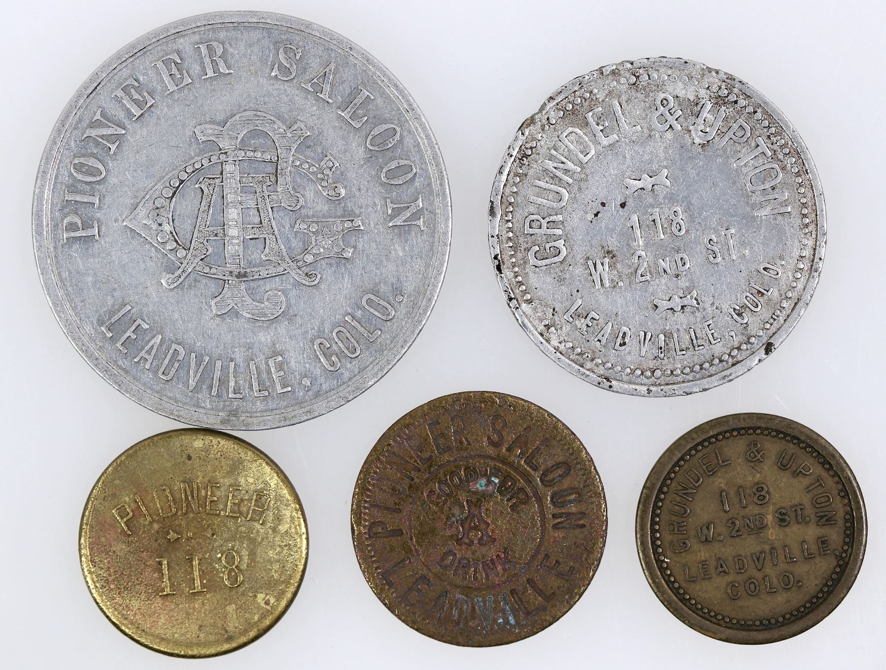 Lot of five tokens from the saloon that also produced the embossed whiskey flask (W 117). 1) PIONEER SALOON / GOOD FOR / A / DRINK / LEADVILLE (all incuse) // (blank); Br., rd., 23 mm. 2) PIONEER / 118 // (blank) ; Br., rd., 21 mm. 3) PIONEER SALOON / AFG (monogram) / LEADVILLE, COLO. // GOOD FOR / 12Ω¢ / IN TRADE / AT MY BAR; Al., rd., 38 mm. 4)