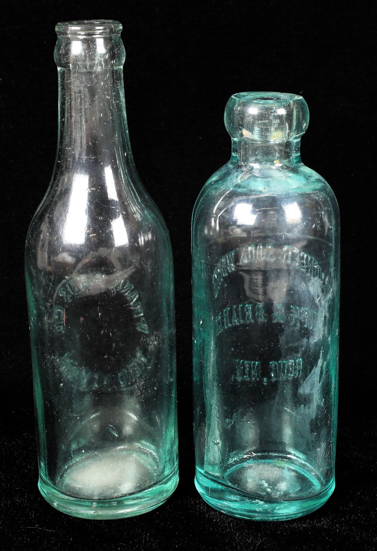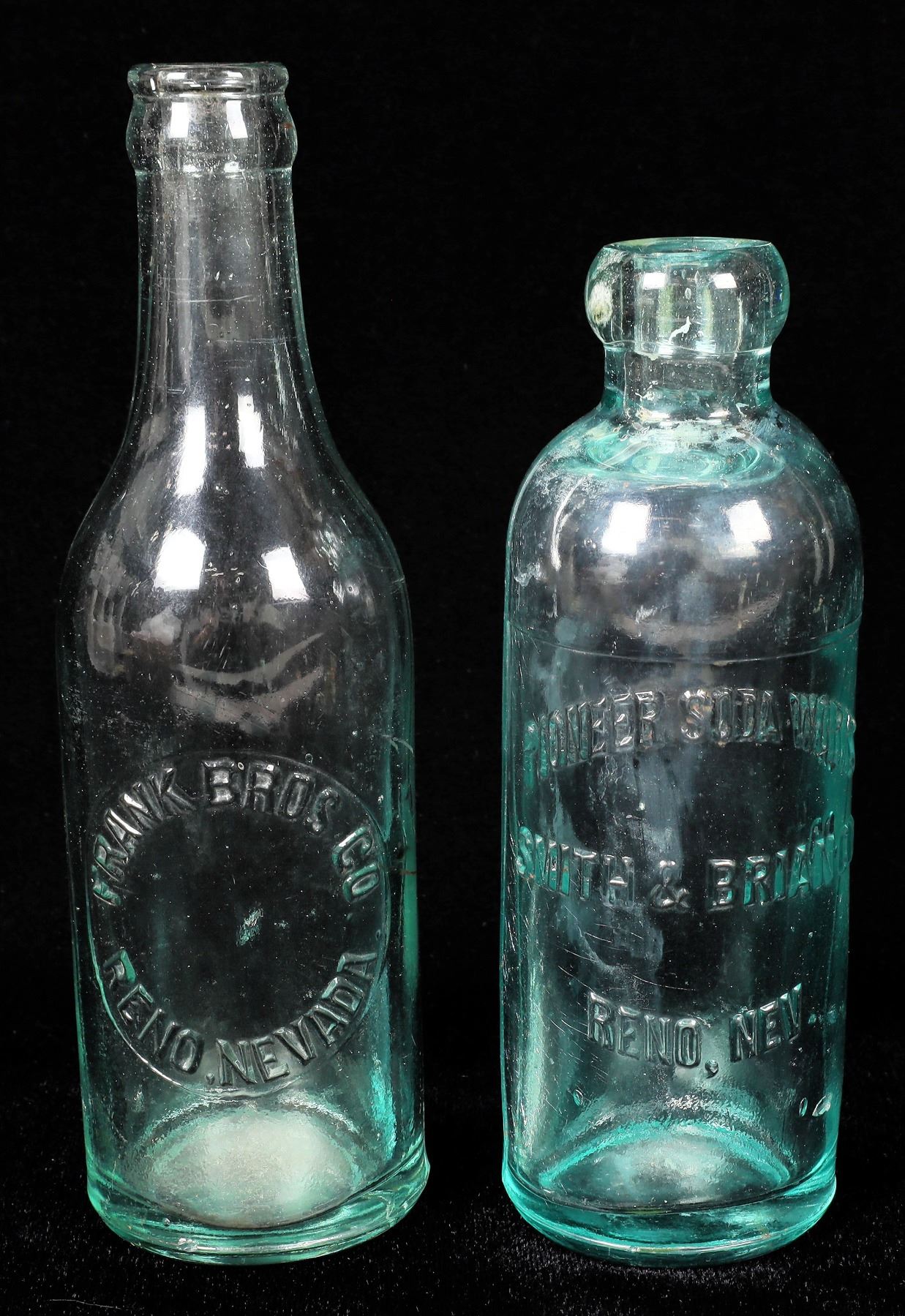 Light aqua crowntop Frank Bros./Reno, NV. Frank Bros., Ben and Sam Frank, bottled soda and beer. Sam was a Reno mayor, and the brothers opened a saloon in 1903. Bottle featured on page 75 of Holabird Volume 1. Aqua applied top Hutch Pioneer Soda Works/Smith & Brian Co./Reno, Nev, c. 1900-06. Smith and Brian advertised themselves as The Soda Men. This company was the successor to Reno Bottling works. Bottle featured on page 116 of Holabird Volume 1. No apparent chips or cracks. Reno Nevada Fred Holabird Collection