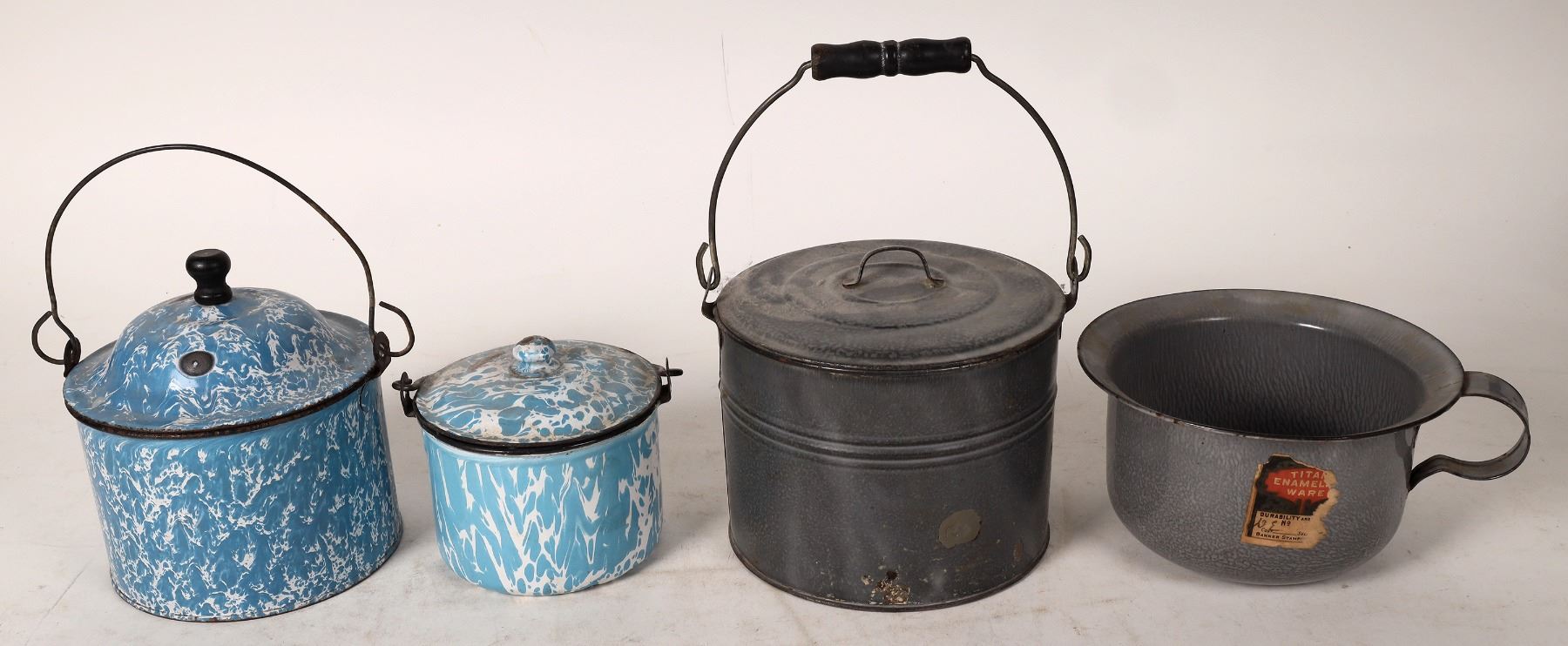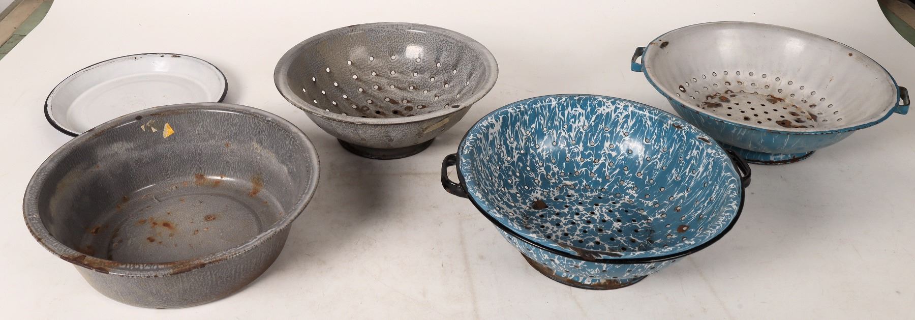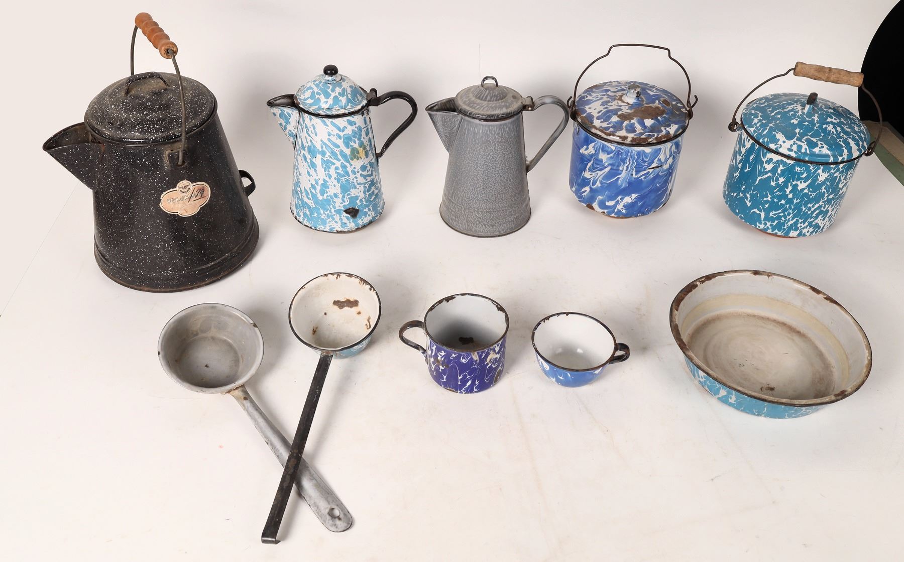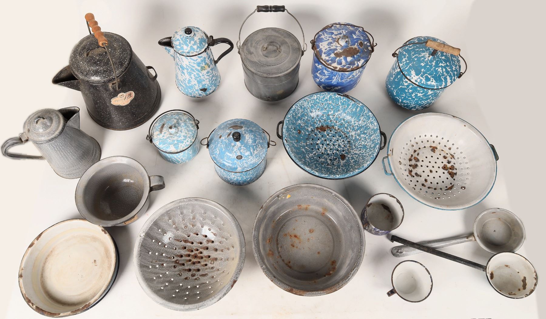A whole cupboard full of pioneer speckleware including items from Columbia, Agate Nickel Steel, Haberman's Granite Ware, Vollrath and probably a couple of more that can't be identified. Pots, bowls, coffee pots and ladles vary in color and pattern, according to manufacturer. There's even a chamber pot in case of emergency. This is a very beautiful and in some ways practical collection as many of these items still have some miles left on them, in case you want to take them camping. Please see photos for more details. Gary Bracken Collection