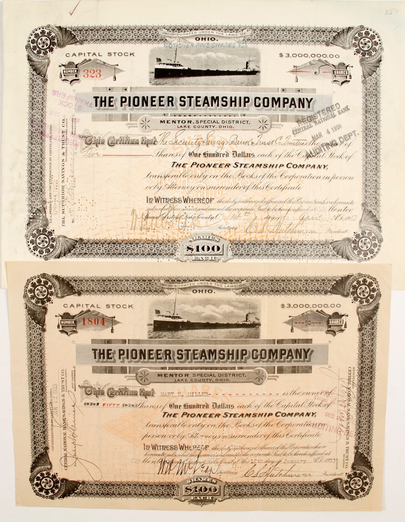 2 different I/C. #1804 Mary Miller 50 shares 1923, 3 323 Security Savings Bank 5 shares 1913-wrinkles and creases. Ship vignettes. Prag Collection. State: Ohio City: Date: 1913-1923 HWAC# 83371