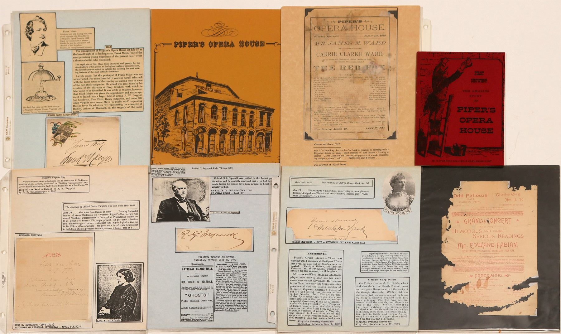 Lot of 7. 1) Original Piper's Opera House handbill for "The Red Fox" performance on August 4th, 1888. Presented by James M. Ward and Carrie Clarke Ward. 8.5 x 5.75" Poor condition. 2) Autograph card for Frank Mayo, aka "Davy Crockett." He got his start performing at Maguire's Opera House in the 1860s. He later created the internationally-known character Davy Crockett. Autograph card is 3.75 x 4.5" 3) Booklet, "First Showing! The Amazing Story of Piper's Opera House" by Katharine Hillyer and Katharine Best. 1953. 23pp. 4) Handbill for the Grand Concert at the Odd Fellows Hall in Carson City, 1890. Very rough condition. 5) Three other stage autographs: Anna Dickinson (1877, women's rights lecturer on the Comstock); R.G. Ingersoll (lecturer on religion); and Helena Modjeska (1891, Comstock actress). Many of the pieces come with background information. (Sutro-Comstock Collection)