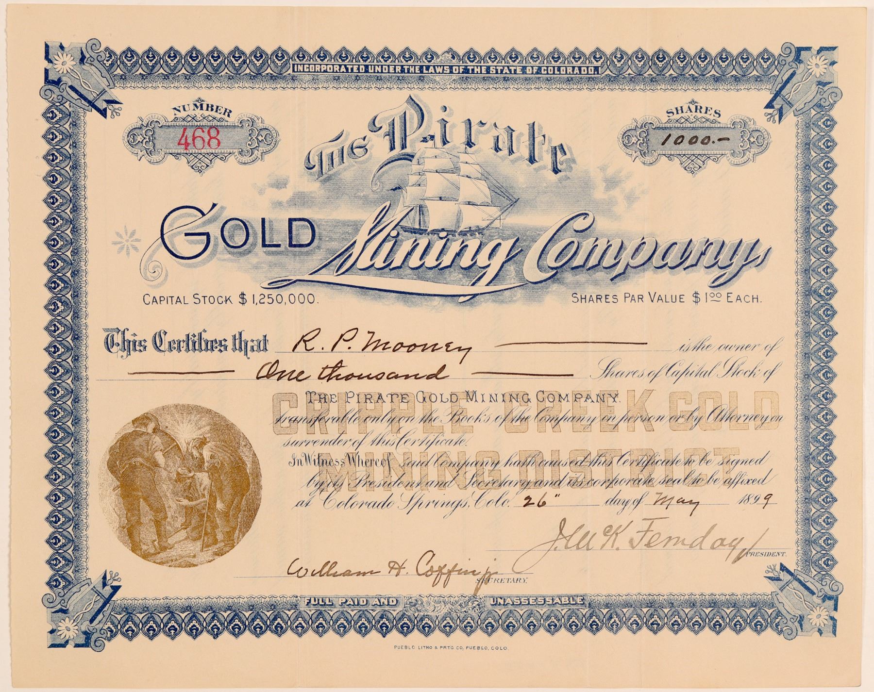 Stock Certificate from the Pirate GMC with a great pirate sailing ship vignette. Located at Cripple Creek. Certificate number 468 issued in 1899 at Colorado Springs, CO to R. P. Mooney. Signed by president J. W. K. Fernday and William H. Coffin. Printed by Pueblo Litho & Prtg Co, Pueblo, Colo. Size 3.75 by 3.75 inches. Not cancelled. Choice vignette of a pirate ship and one of working miners. Blue scrip and border. No apparent corner, edge or discoloration issues. The Pirate Gold Mining Company owned 45 acres of rich land only 3/4 of a mile from the Lincoln group of mines at Gillett. [Valley Falls Vindicator]