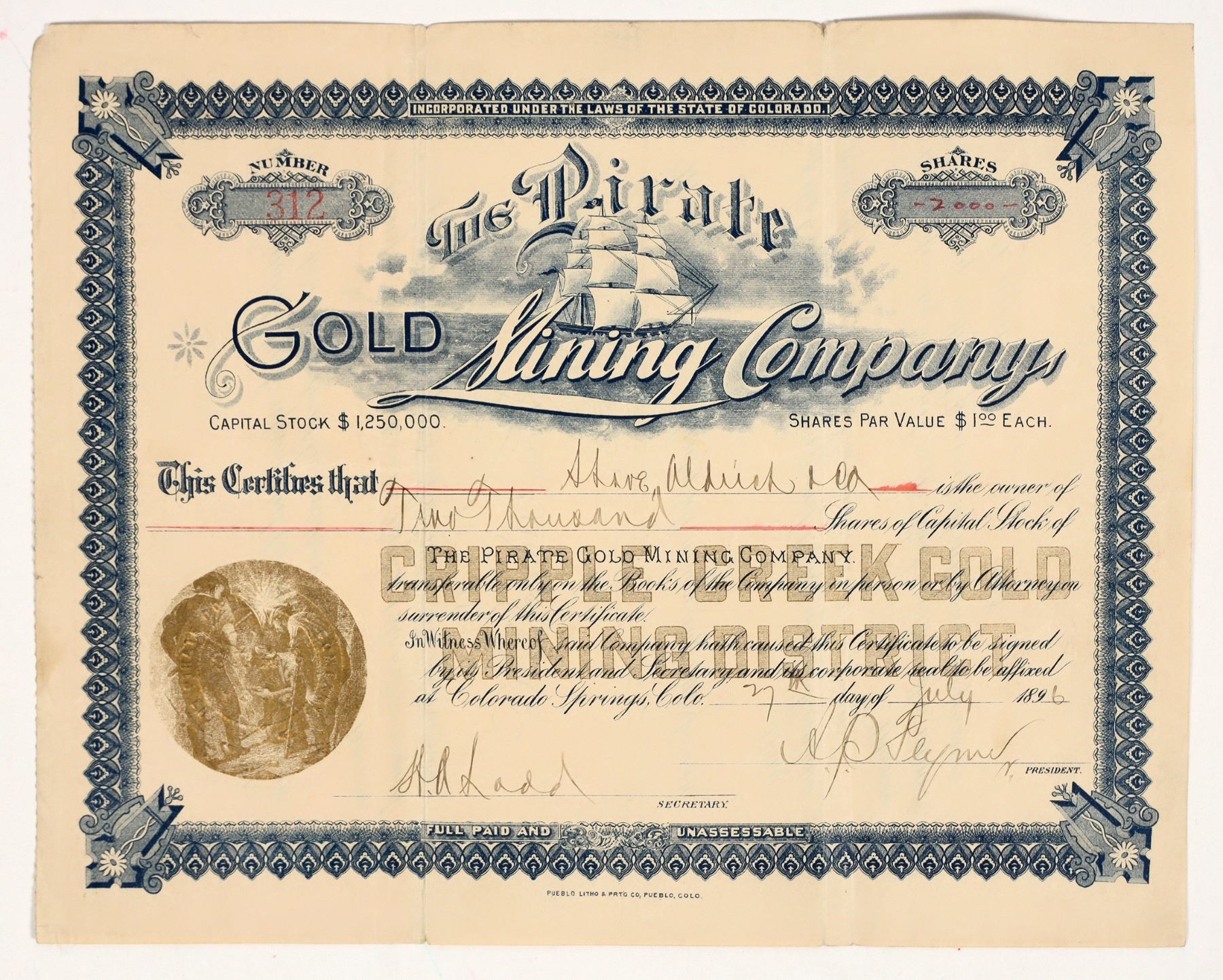 Fantastic. Inc. in Colorado. No. 312, issued for 2000 shares to Adams, Aldrich & Co. in Colorado Springs in 1896. Signed by vice president and secretary. Not cancelled. Blue border and print, gold mining vignette and fancy logo with pirate ship incorporated! Cripple Creek Gold Mining District underprint. Deep folds with some separation, toning. 7.5 x 9.5" Not listed in Hills. The Pirate Gold Mining Company owned 45 acres of rich land only 3/4 of a mile from the Lincoln group of mines at Gillett. [Valley Falls Vindicator]