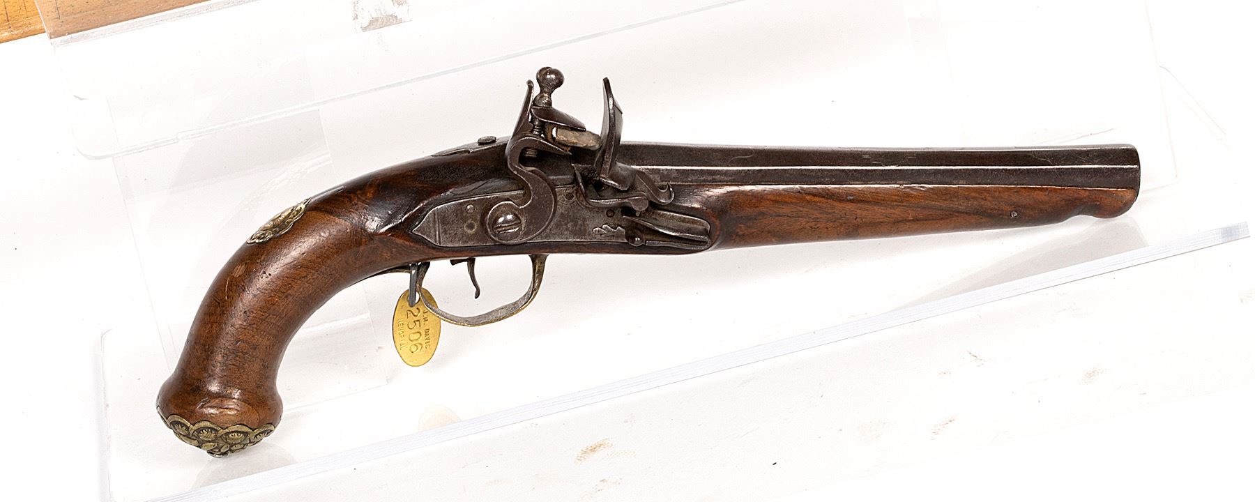This is a very beautiful flintlock dueling pistol; one of a pair? It is cased in European walnut and curiously without a ramrod. There would not be a need for a second shot with a dueling pistol; at least in theory? Estimated about 1790-1820's. With beautifully engraved brass hardware. About .66 cal. in excellent condition. SN: N/A, JMD Oval Tag: 2506, Condition: Excellent, >