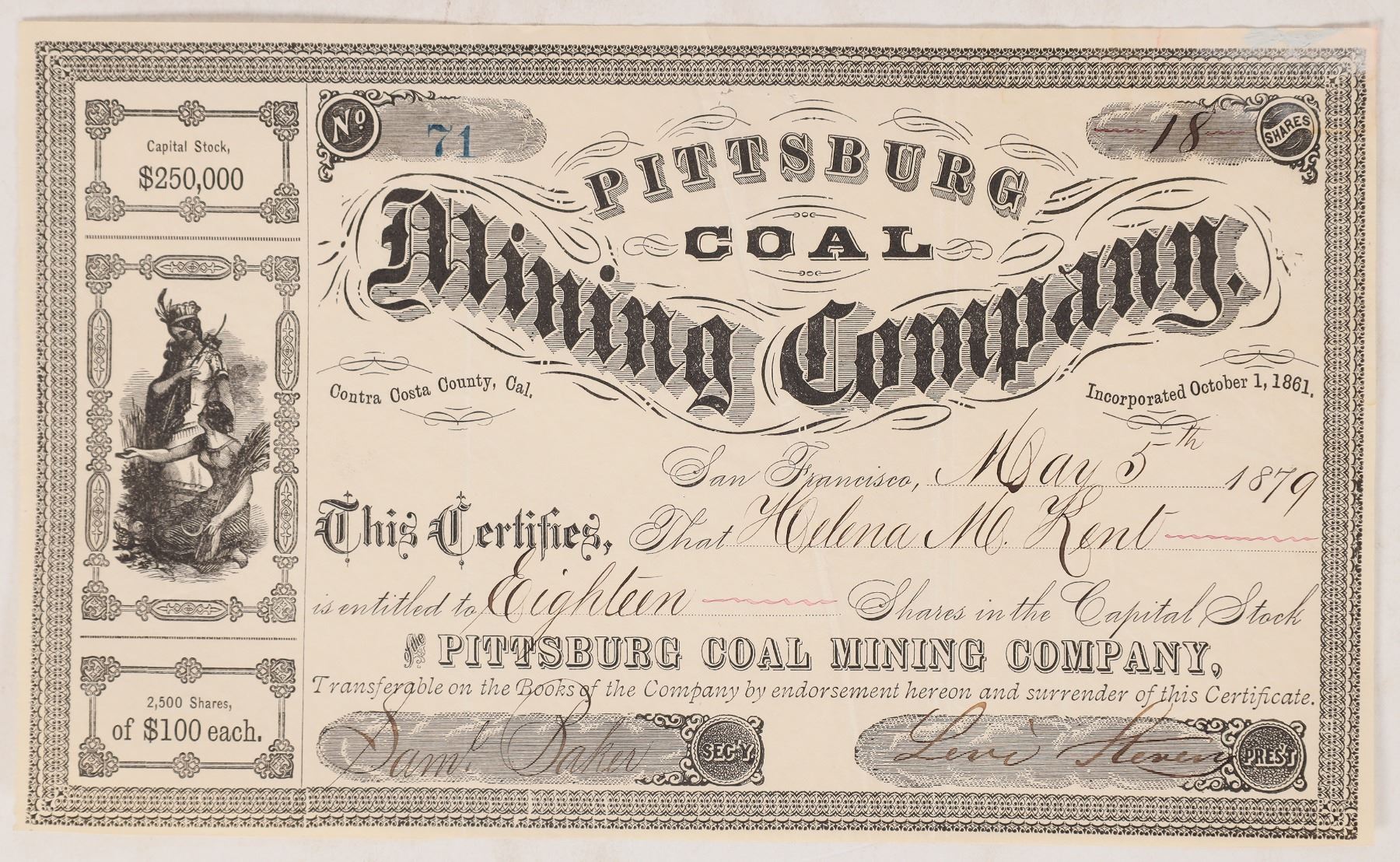 Stock certificate for The Pittsburg Coal Mining Company #71 issued to Helena M. Kent for eighteen (1*0 shares at $100 per share. This company out of Contra Costa, California, was incorporated in October 1861. It is signed by Samuel Baker, secretary and Levi Stevens (?) president. It is in great condition and doesn't appear to be canceled. Please see photos for more details. Pittsburg California