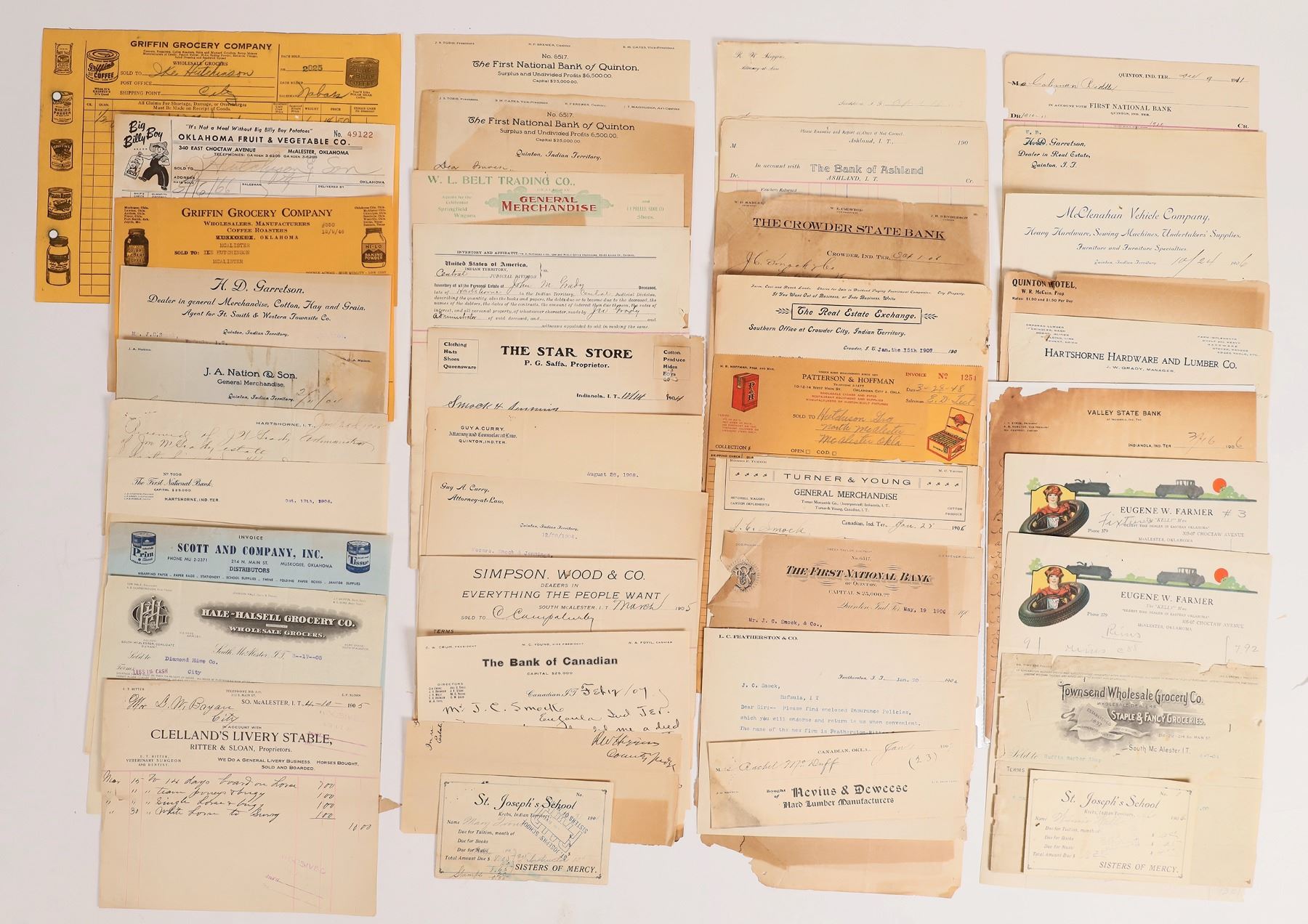 Lot of about 75 pieces. Includes billheads, letterheads, and ephemera, c.1900-1910s. Towns include: Hartshorne, Haileyville, Indianola, Quinton, Canadian, McAlester, Alderson, Savanna, Featherstone, Ashland, and Crowder. Pittsburg County is located in SE Oklahoma. Was part of the Choctaw Nation. Please inspect.