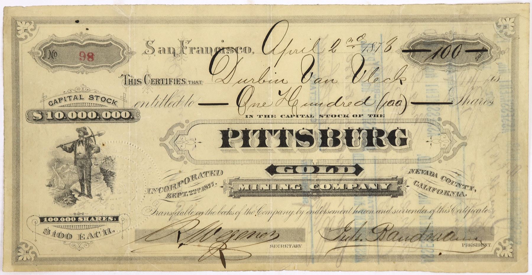 Rare! Nevada County, California (printed below logo). Inc. Sept. 22nd, 1877, No. 98, issued for 100 shares to Durbin Van Vleck on April 2nd, 1878 in San Francisco. Signed by president Julius Bandmann and secretary R. Wegener. Not cancelled. Small vignette of prospector standing with pick over should and scale in his hand. No printer listed. Pinholes, folds, crinkle at bottom center fold. 5 x 9.5" Discovered in 1861. Located between the Sierra Nevada and the old Sacramento and Meredith. Originally explored by a 540 ft. tunnel into Cedar Hill, which did provide some results. They decided to sink a shaft which, in 1878, was 300 feet below the tunnel. A drift from this tunnel struck ore that assayed at $7 gold per ton. They have erected more machinery to continue exploring (as of Sept. 1878.). [Ref: Pacific Coast Annual Mining Review, 1878, pg 232-33] The Van Vleck family were major Western mining investors. Durbin Van Vleck was an early San Francisco wood block engraver. City:Nevada County State:California Date:1878
