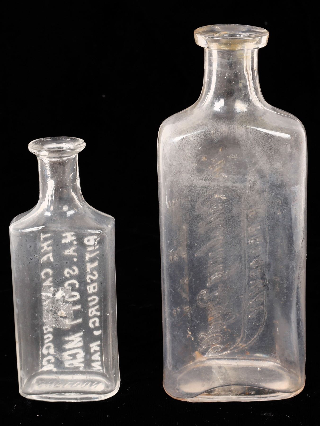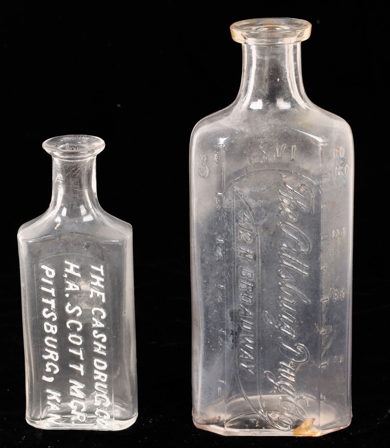 2 Pittsburg medicine bottles. The Cash Drug Co. 4.25" and lip chip. The Pittsburg Drug Co. 6" with internal base chip? Kansas Pittsburg Gary Bracken Collection