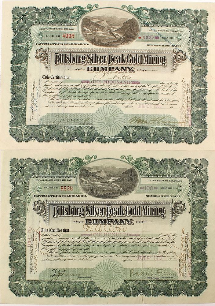Issued in 1908 and 1912. Incorporated in Delaware. Mine was in Silver Peak, Nevada in Esmeralda County. This was the only source of lithium in U.S. Beautiful vignette of mountains, a mine and a miner walking in wilderness. President was Ralph Flinn. This mine was abandoned in 1917. 11" x 8". City: Esmeralda County State: Nevada Date: 1908 - 1912 HWAC # 51523
