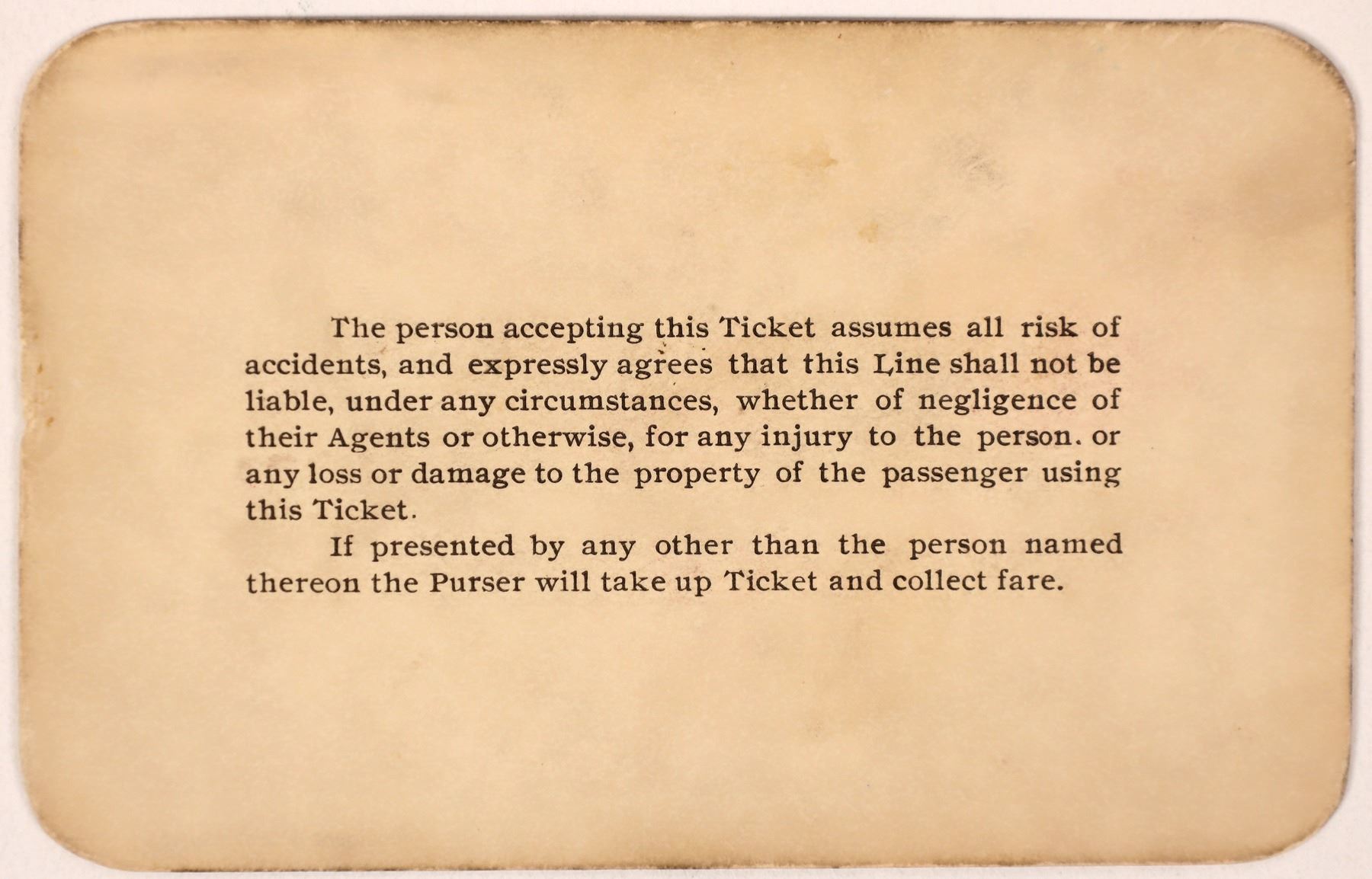 "The Waterway of the World." Pass no. 1261, issued to ET Brinker of the Niagara Falls & Lewiston Railroad. Signed by president Jas. A. Henderson. Great looking design with wheel logo and red vignette of steamship. Printed on cardstock. No printer listed. Soiling, creased side. Organized in the 1870s by Thomas Stevenson Calhoon and Jackman Taylor Stockdale of Georgetown, PA.