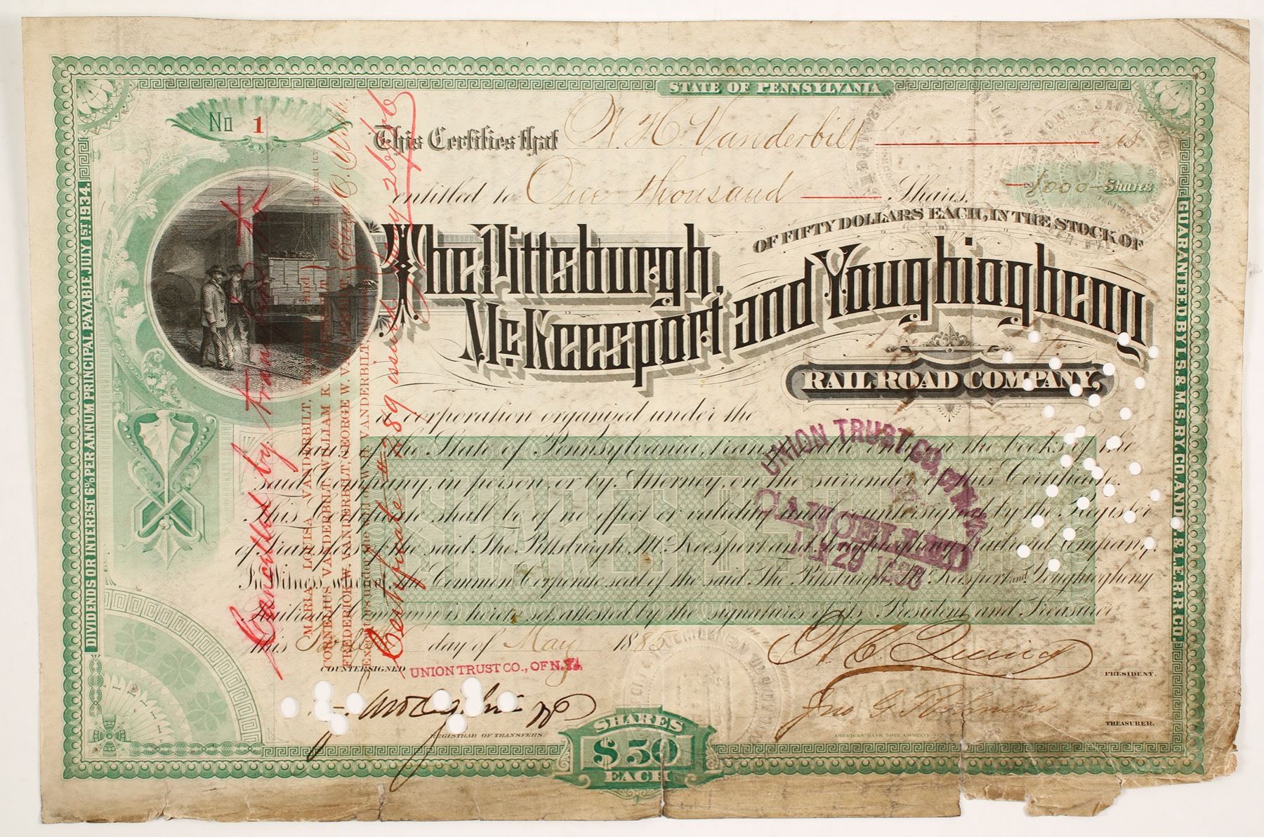 Cancelled 1,000 shares of McKeesport and Younghiogheny Rail Road Co, cert. #1 issued to W.H. Vanderbilt, oldest son of Commodore Cornelius Vanderbilt, businessman and philanthropist. Two raised company seals. Pittsburgh, McKeesport and Youghiogheny Railroad started operations in 1881 and stopped service in 1965. Original line between Youngstown. OH and Pittsburgh, PA opened in 1879. Purchased smaller railroads enabling them to operated north to Youngstown and south to Connellsville. Provided transportation from the steel centers of Pittsburgh to the Great Lakes and St. Lawrence Seaway area. The original line ran between Youngstown, Ohio and 24th St in Pittsburgh, PA near the Jones and Laughlin Iron Works, opened in 1879. Printed: American Bank Note Co. New York. Prag collection.