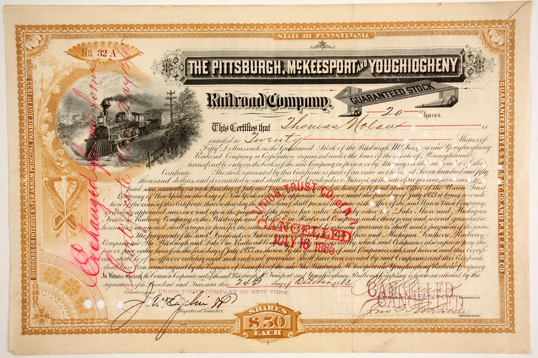 # 32 A for 20 shares to Thomas Nolau. Names are cancelled and difficult to read. Cancelled. Red ink has run as part of the cancel. Steam locomotive vignette. This line is associated with William Henry Vanderbilt. Ken Prag Collection