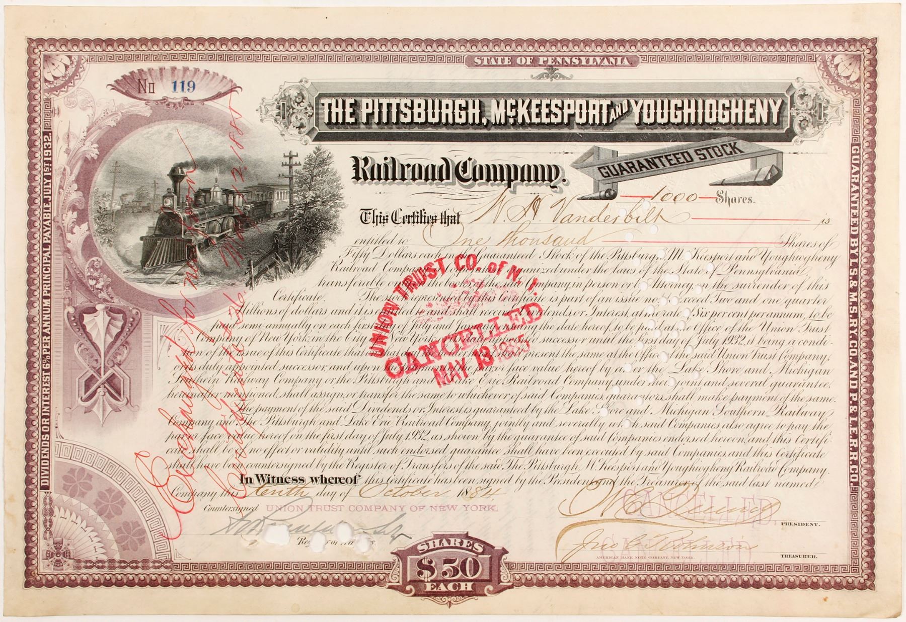 I/C #119 W Vanderbilt 100 shares 1884. Signed by President illegible. Crease and pin holes. Prag Collection. State: City: Date: 1884 HWAC# 83271