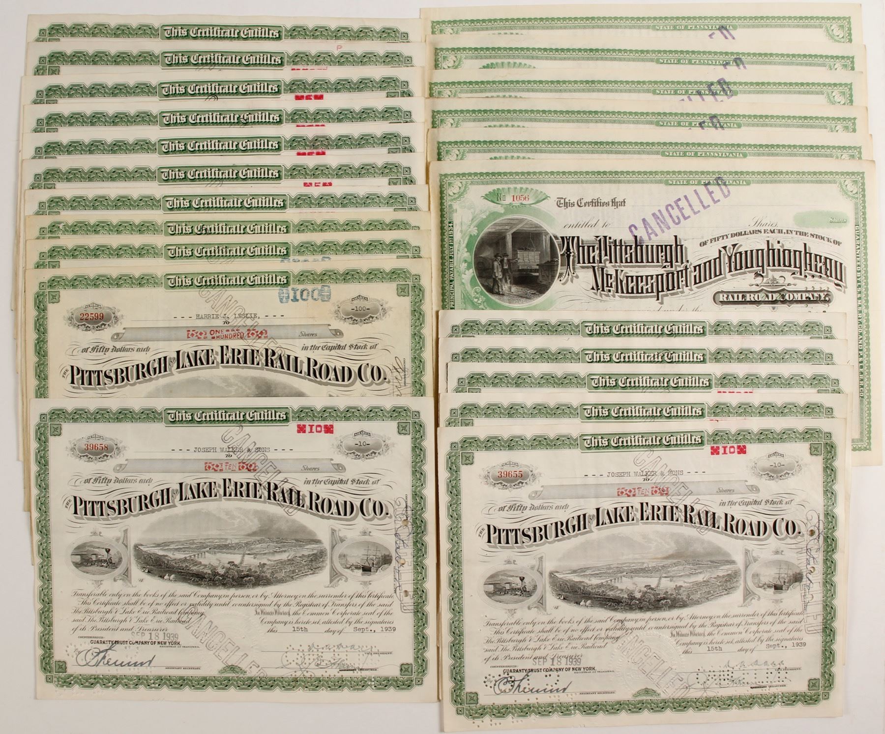 22 total certificates. 16 are, The Pittsburgh and Lake Erie Railroad Company and the other 6 are, The Pittsburgh, McKeesport and Youghiogheny Railroad Company. All i/c; some signed and canceled via hole punch; all in very good condition, very nice quality vignettes on both, green trim; printed by Continental Bank Note Company. Prag Collection. City: State: Date: 1900's HWAC# 81062