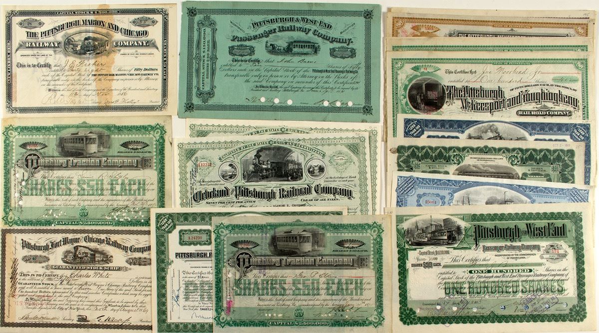 Lot of 18 pictorial from multiple Pittsburg rails. 1) Best two pieces are two stocks for The Pittsburgh, McKeesport and Youghioghney Railroad Company that are signed on the reverse by Cornelius Vanderbilt II (1843-1899), favorite grandson of Commodore Cornelius Vanderbilt, and a successful railroad tycoon himself. He took over the New York Central and other rails from his father and grandfather in 1885. Both signatures have been punch cancelled. There are 4 other stocks included from this company, issued 1884-86, all punch cancelled. 2) Also included: Pittsburgh Fort Wayne & Chicago Railway Co. (1869, stamp cancelled, and 1952, 1959, punched), Pittsburgh Traction Company (1892 & 1895, punched), Pittsburgh & Allegheny Valley Traction Co. (1910, punched), Pittsburgh & West End Passenger Railway Co. two different, (1884 & 1894, punched), Pittsburgh, Marion & Chicago Railway Co. (1886, not cancelled), Cleveland & Pittsburgh Railroad Co. (1948 & 1949, punched), and Erie & Pittsburgh Railroad Co. (1959, punched). (Prag Collection) City: Pittsburgh State: Pennsylvania Date: 1869-1959 hwac# 34568