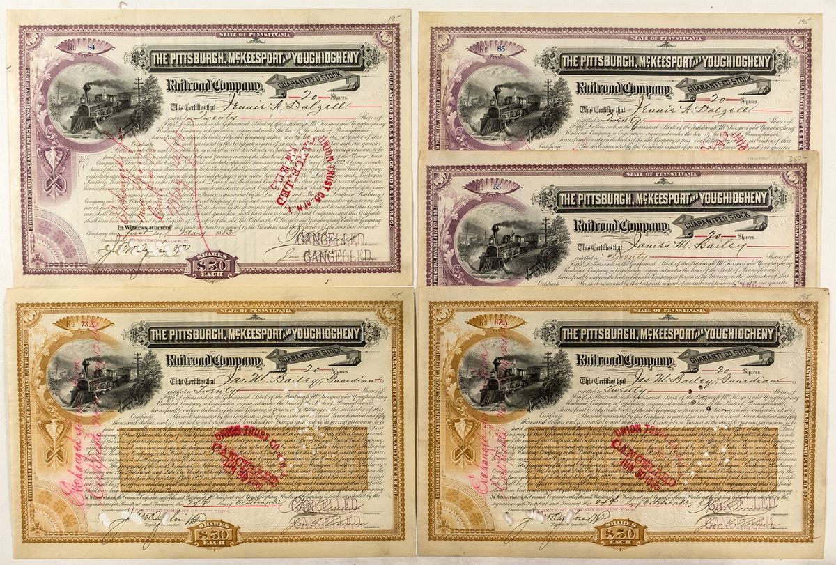 Five stocks for The Pittsburgh, McKeesport and Youghiogheny Railroad Company signed on the reverse by Cornelius Vanderbilt II as acting secretary. As the favorite grandson of railroad tycoon Cornelius Vanderbilt, Cornelius II inherited millions from his grandfather and father, allowing him to continue the Vanderbilt socialite and philanthropist tradition in New York, as well as taking control of the New York Central and other family owned rails in 1885. The signatures on these pictorial stocks have been punch cancelled. 8.25" x 12.25" with folds and light wear. (Prag Collection) City: Pittsburgh State: Pennsylvania Date: 1883 hwac# 34575