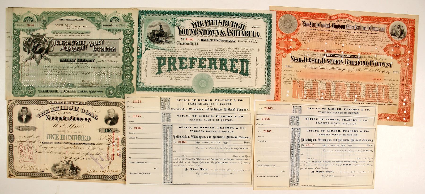 The Lehigh Coal & Navigation Co., No A153097 for 100 shares, issued, p/c, signed by President; The Pittsburgh Youngstown & Ashtabula Railroad Co., No. A820 (unissued); Federal Street and Pleasant Valley Passenger Railway Co. No 3484 for 300 shares, issued/ p/c. Signed by President; New Jersey Junction Railroad Co., First Mortgage Bond with steamer vignette & allegorical women in top right vignette. No R393, p/c.