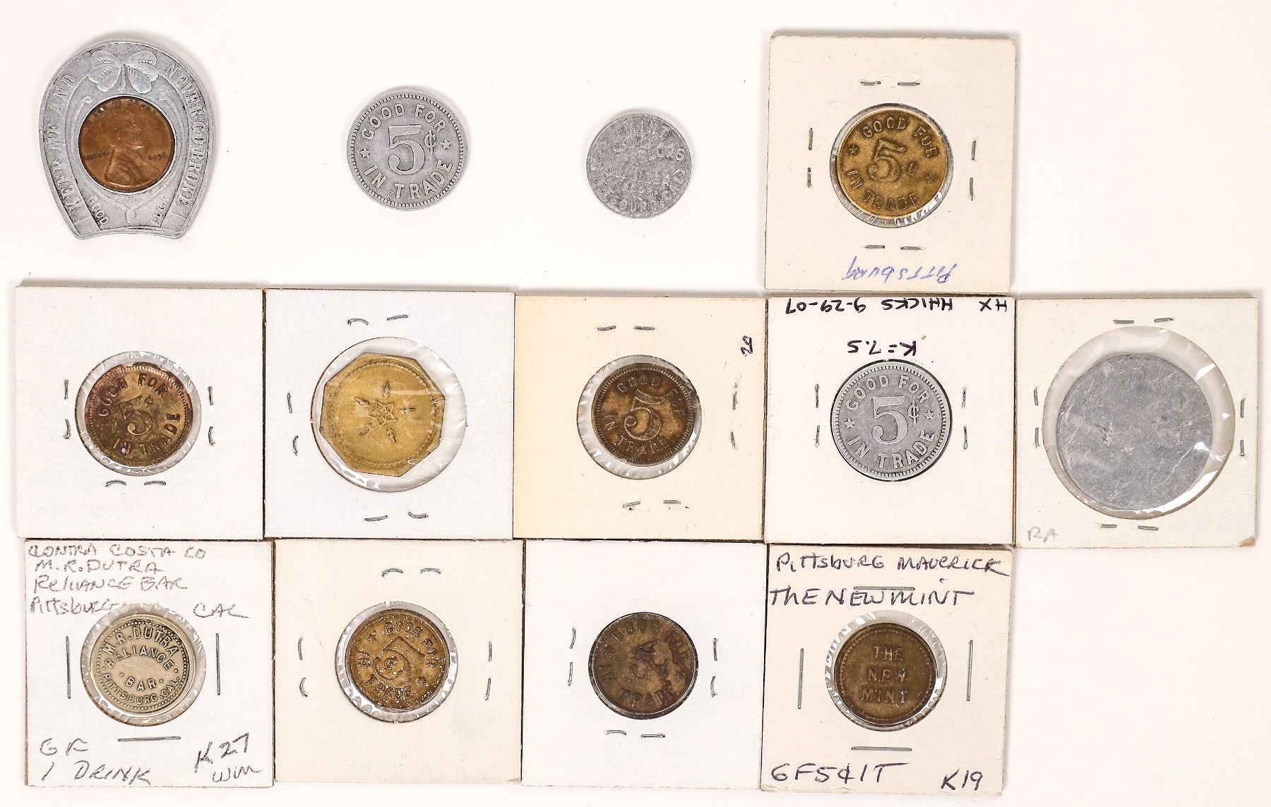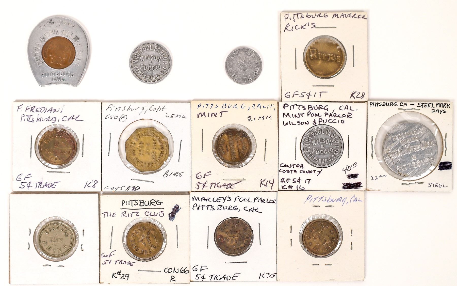 13 Pittsburgh tokens. Contra Costa County Bank, Marley's Pool Parlor, The Ritz Club, Ricks, Steelmark Days, F. Frediani, Pettas Auto Stages, Mint, Wilson & Puccio, K 16 & K17 Mint Pool Parlor, The New Mint, M R Dutra. California Pittsburgh