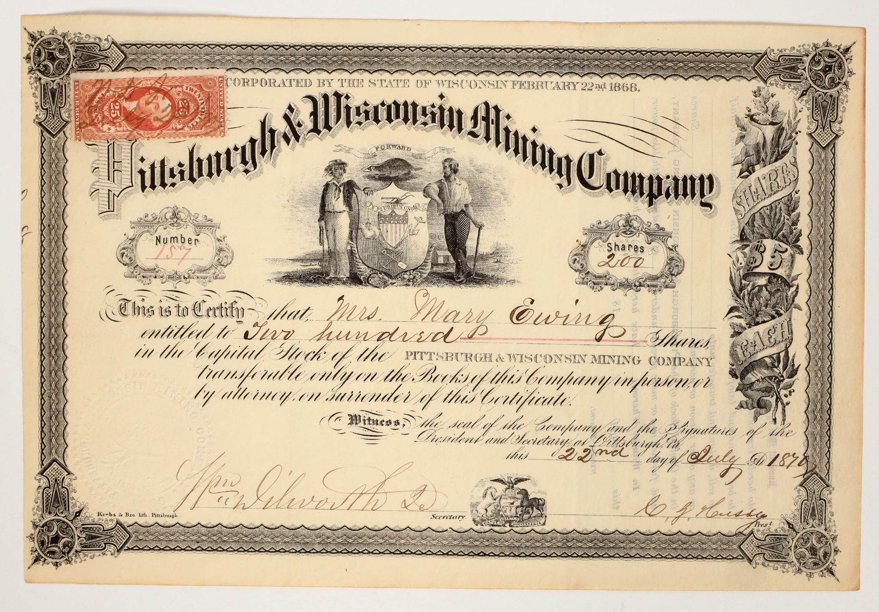 Inc. in Wisconsin, 1866. No. 157, issued for 200 shares to Mrs. Mary Ewing in 1870. Signed by president Hussey and the secretary Not cancelled. Allegorical vignette with beaver. 25 cent revenue stamp at upper left. Folds, light discoloration. According to the Grant County Herald