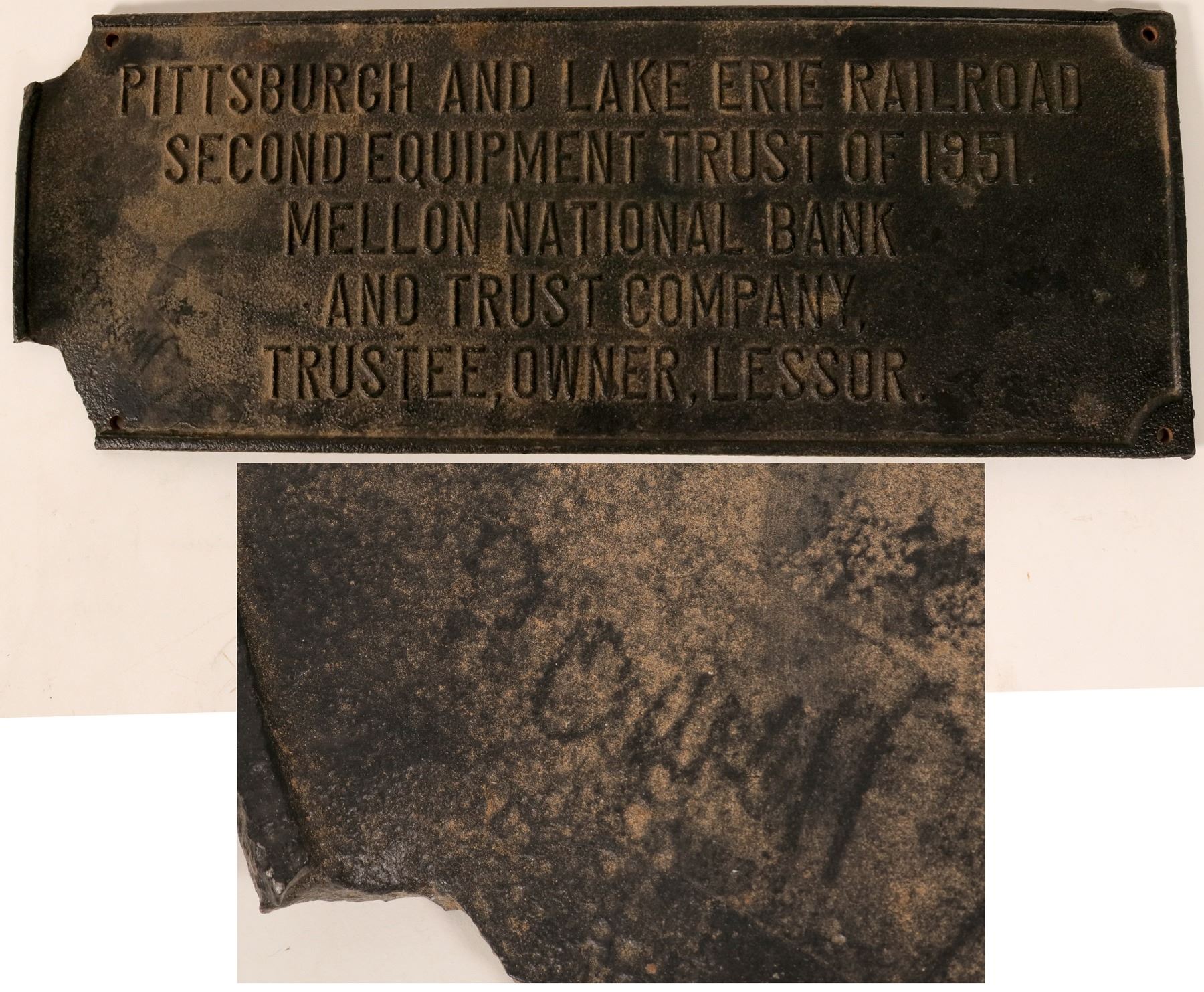 Metal plate, 16 x 6 1/2 inches, inscribed: "Pittsburgh and Lake Erie Railroad / Second Equipment Trust of 1951 / Mellon National Bank / And Trust Company / Trustee, Owner, Lessor." Four corner holes for mounting.