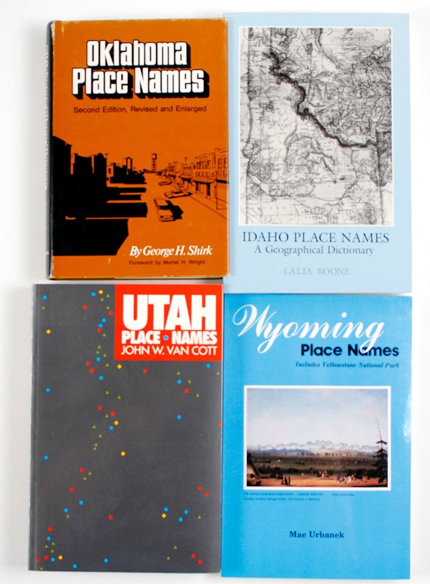 Lot of 4 books: 1) Utah Place/Names by John W. Van Cott, c. 1990, pp. 453; 2) Idaho Place Names A Geographical Dictionary by Lalia Boone, c. 1988, pp. 413; 3) Oklahoma Place Names Second Edition, by George H. Shirk, c. 1974 pp. 268 4)Wyoming Place Names Includes Yellowstone National Park by Mae Urbanek, c.1988, pp.233. All books in good condition. Date: Location: HWAC# 63476