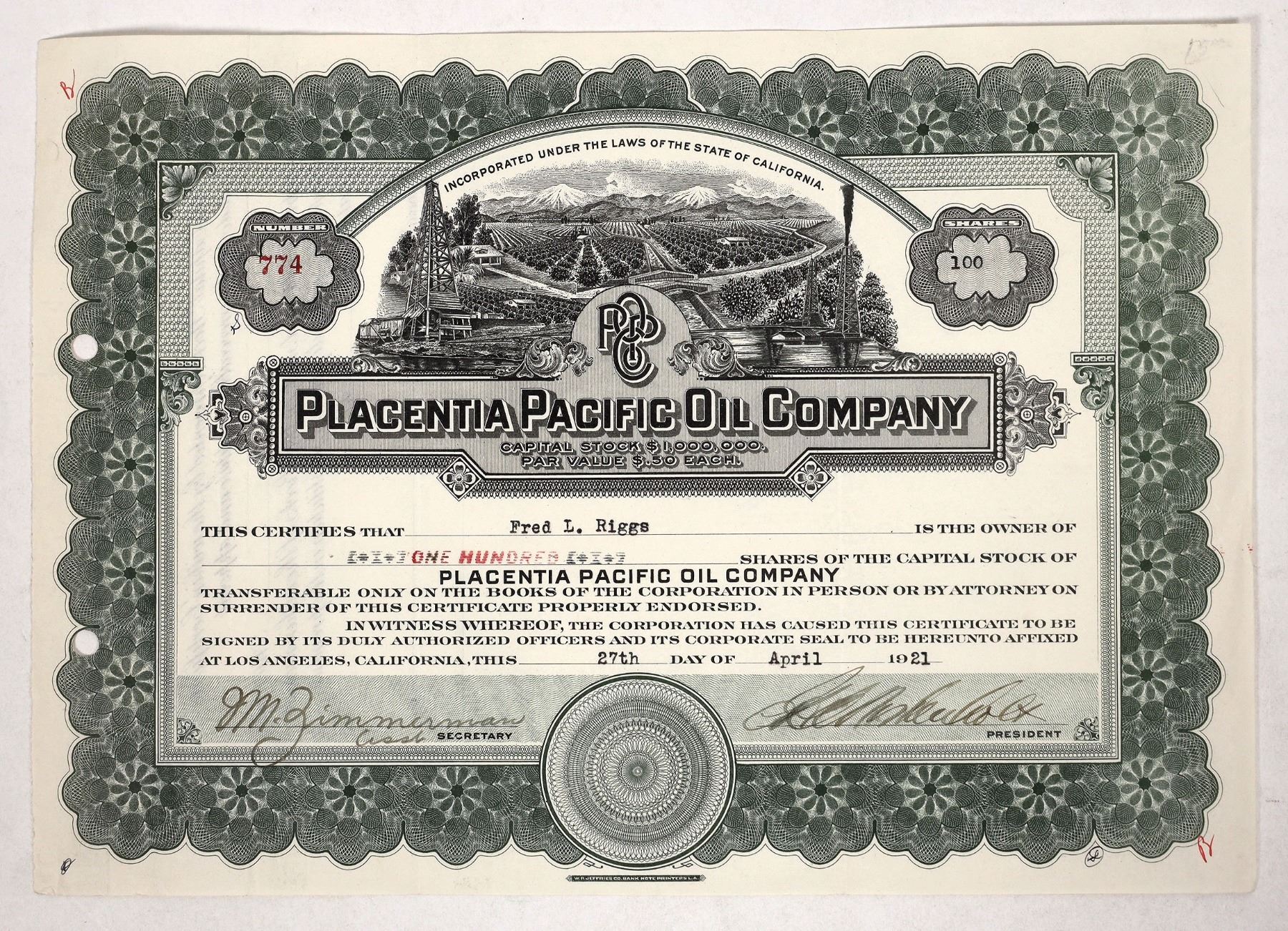 Issued to Fred L. Riggs on April 27, 1921 for 100 shares at $1.50 per. This is certificate 774 and is signed by assistant secretary J.M. Zimmerman and illegible president signature. There's a beautiful vignette of a fertile valley with oil derricks on both sides of the picture.