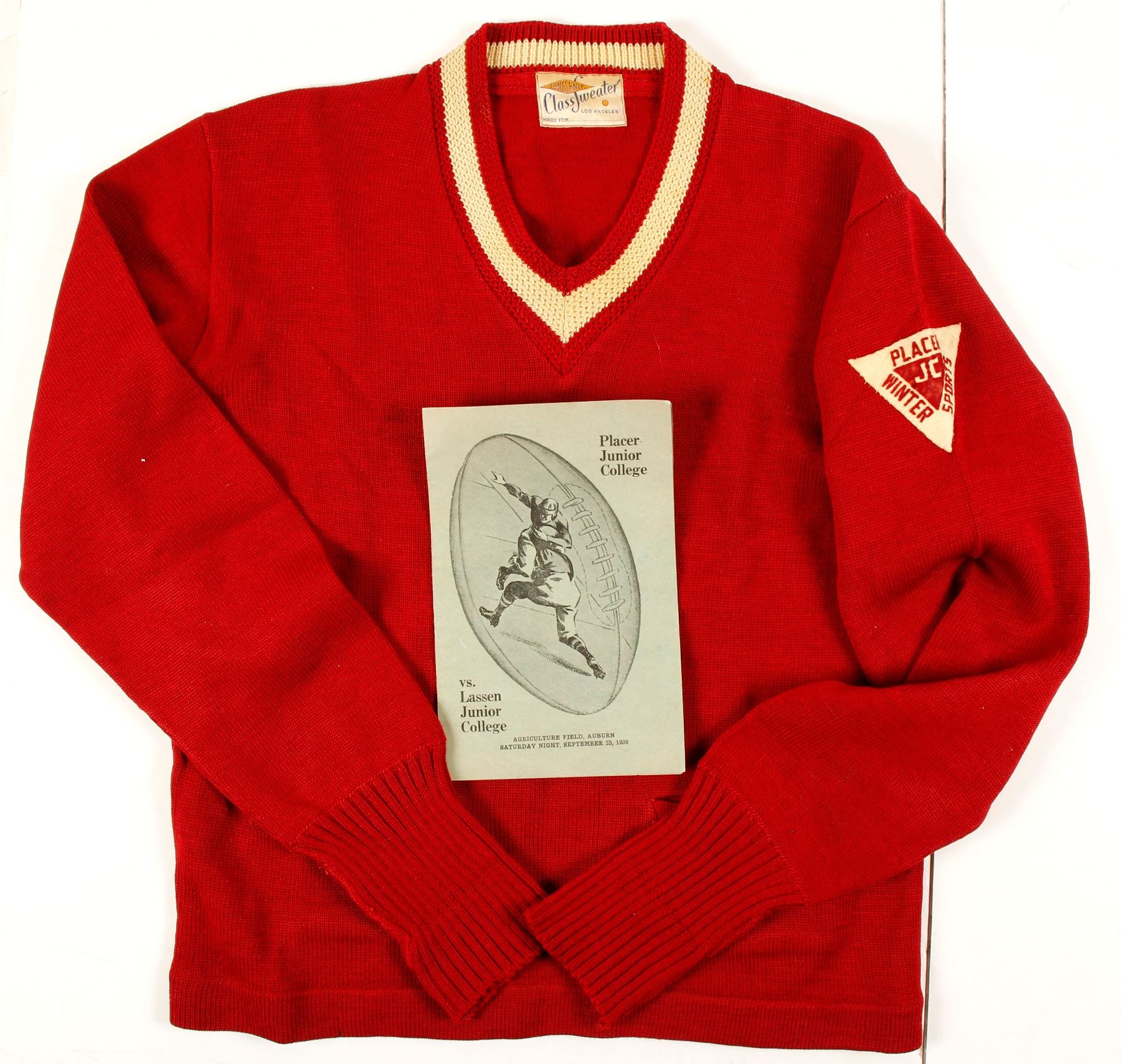 Small crimson sweater with Placer JC Winter Sports patch, nice condition. Sept 23 1939 vs. Lassen football program. City: Placer County State: California Date: HWAC# 81424