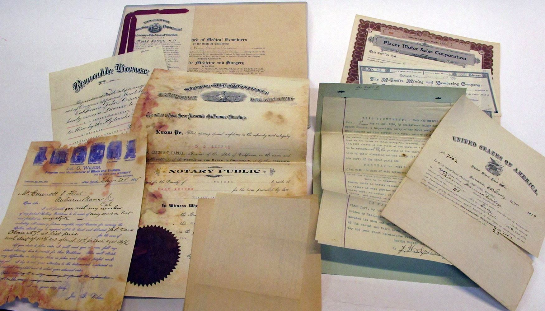 This lot contains 12 pieces of interesting and unique ephemera from Placer County. Included are a couple of stock certificates, a banking letter, a document from the coroners office, mining license, etc. All are in very good condition. Date: Location: California HWAC# 571810