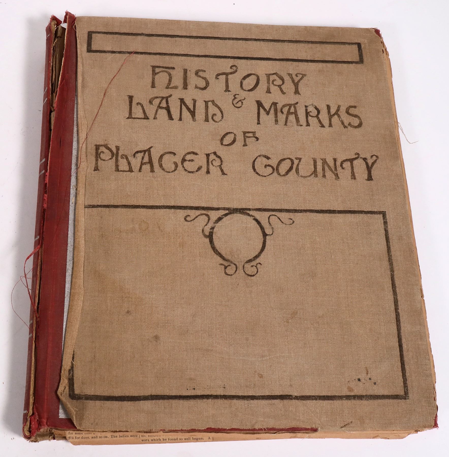 A really nice group of 10 original large photographs in excellent condition in this scrap book with cover labeled History/Land & Marks/of Placer County. The photos include Michigan Bluff Stanford House 1917, 10x13.5". Placer County Pioneers 1893 8x10". Hydraulic elevator mining 1890, 8x10". 5 loose personal photos, 5x7" to 8x10". Last Chance pioneer miners 1905, 5x7". Monument to stage horse shot by stage robber 1904, 4x5". Old Placer court house 1890, 4x5". 14x 3x5" snap shots. Freighting from Sacramento to Auburn 1894, 8x10". Hydraulic mining at Michigan Bluff 1890, 8x10". Logging at Forest Hill 1895, 5x7". Early stage coach at Auburn c. 1895 5x7". Many pages of scrap book style newspaper articles. Book 15x13". Pages are detached, spine is torn, but the photos are great! Please inspect. From the Nicholls Estate of Dutch Flats.