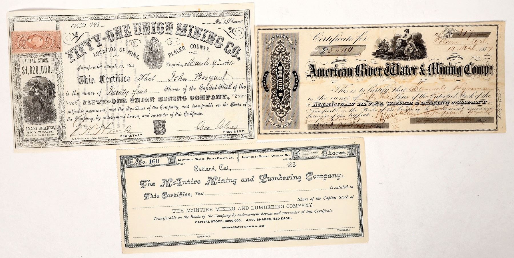 1)Issued 1857 American River Water & Mining-staple holes and water stain. The company was working "Doten's Bar" and Mormon Island on branches of the American River. It was formed in December 1854 to build a ditch to divert water from the North Fork of the American River to bring drinking water and irrigation to the area mining operations. 2) 1864 Fifty-one Union Mining with adhesive RN stamp. Virginia was opened to mining in the year 1852, by the discovery of gold on the adjoining hills and ravines. The want of water during the dry season retarded the work of miners for two or three years subsequent, which was finally remedied by the introduction of water by the same canal which conveyed water into the Gold Hill district. In 1853, a company of miners built a railroad track from Virginia Hill to the Auburn 'ravine, for the transportation of ore. This road was certainly the pioneer railroad of Placer, if not the first laid down in the State for any purpose. The work was finally abandoned by the company, and its labor was redirected towards the introduction of water, through canals, direct to the tops of the various hills lying in and composing the Virginia district. John Bosquit (or Bosquet) was a representative for Placer County in the 1865 California Assembly. He died Nov. 9, 1868. [Ref: Bancroft, Gudde] 3) Unissued c. 1880's McIntire Mining and Lumbering.