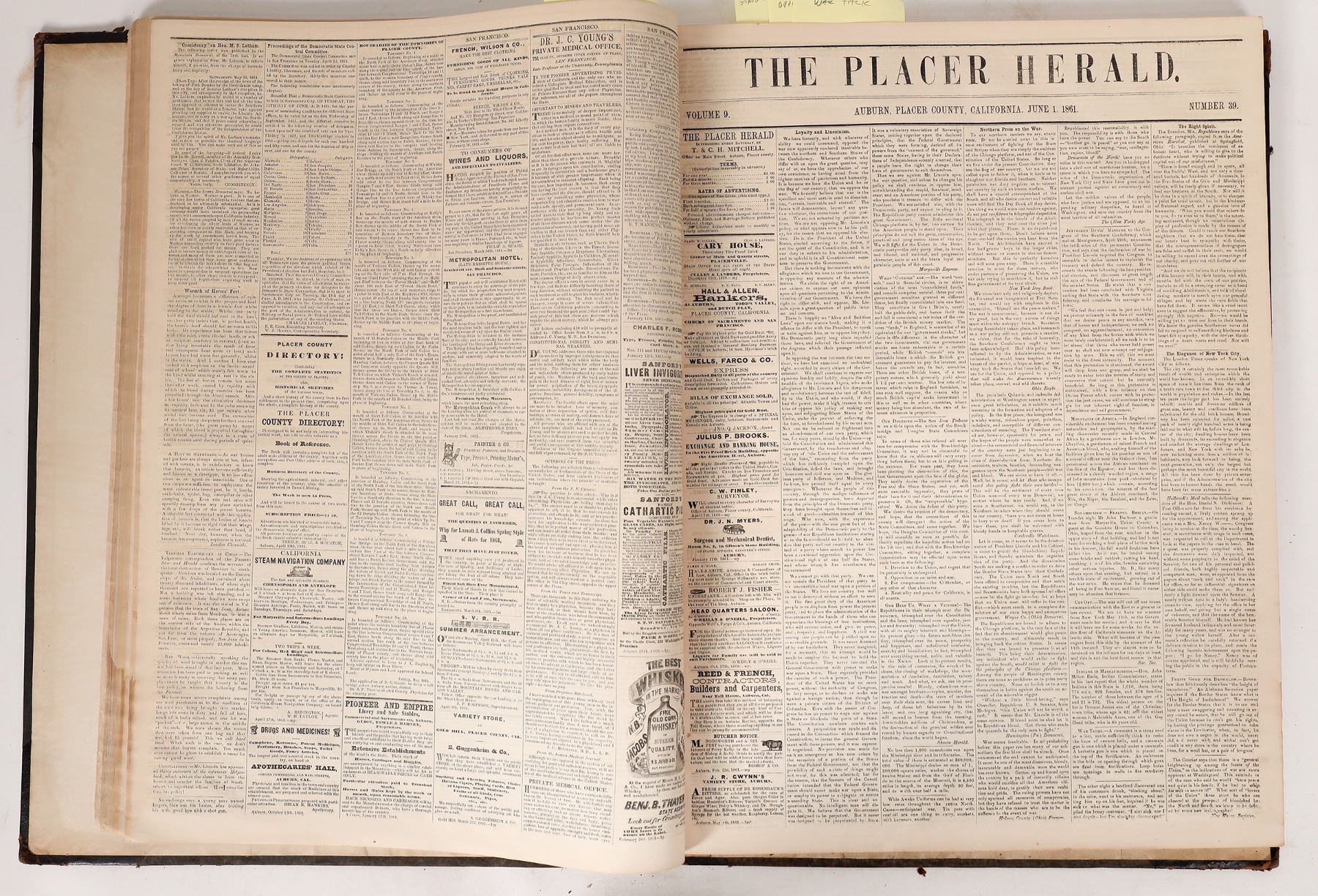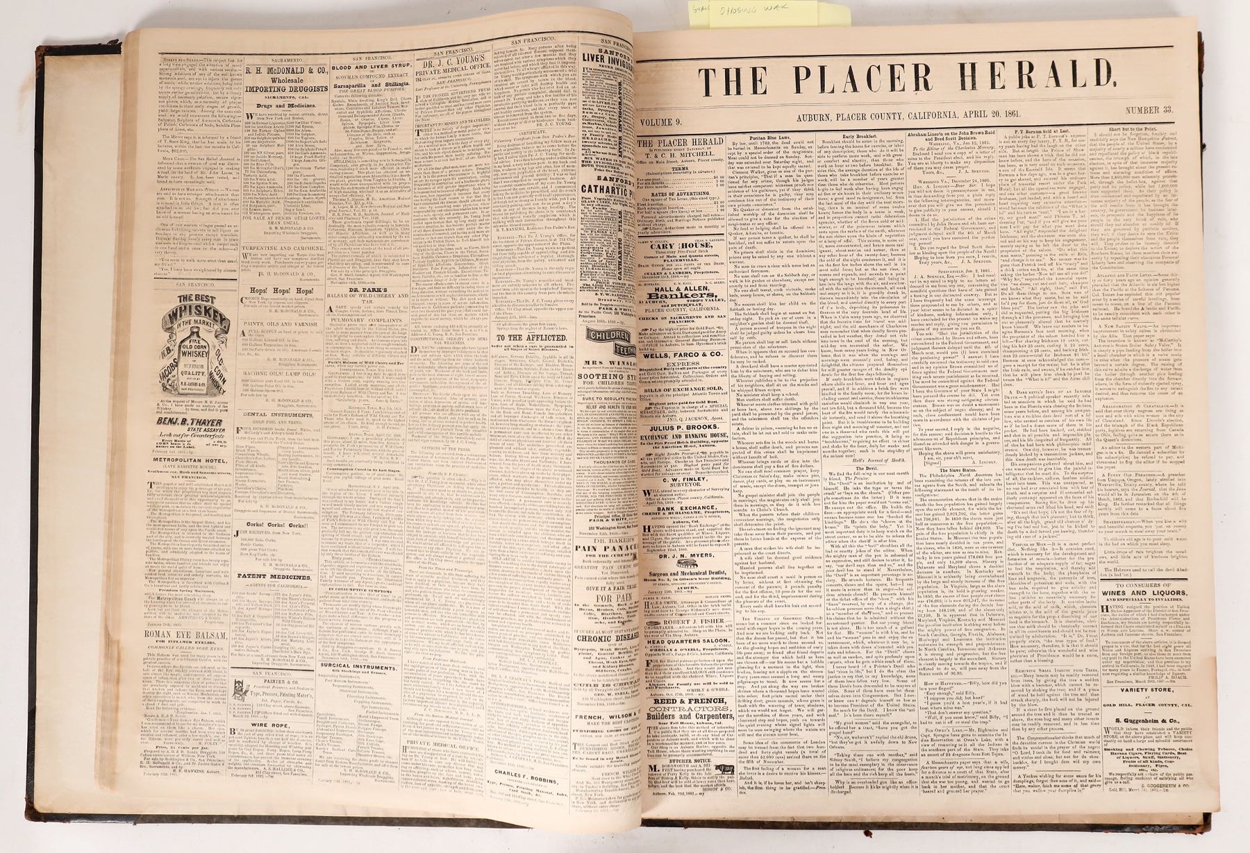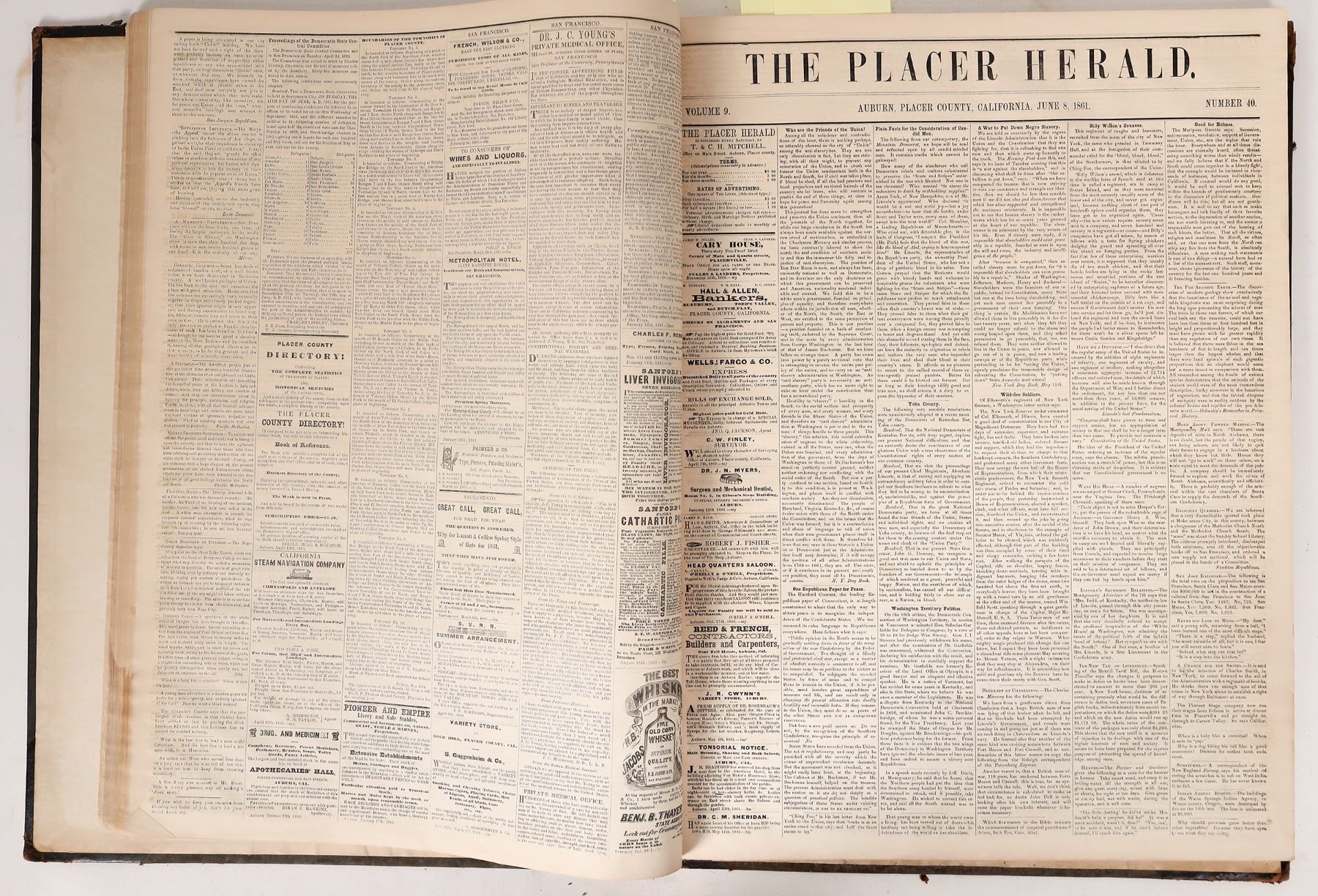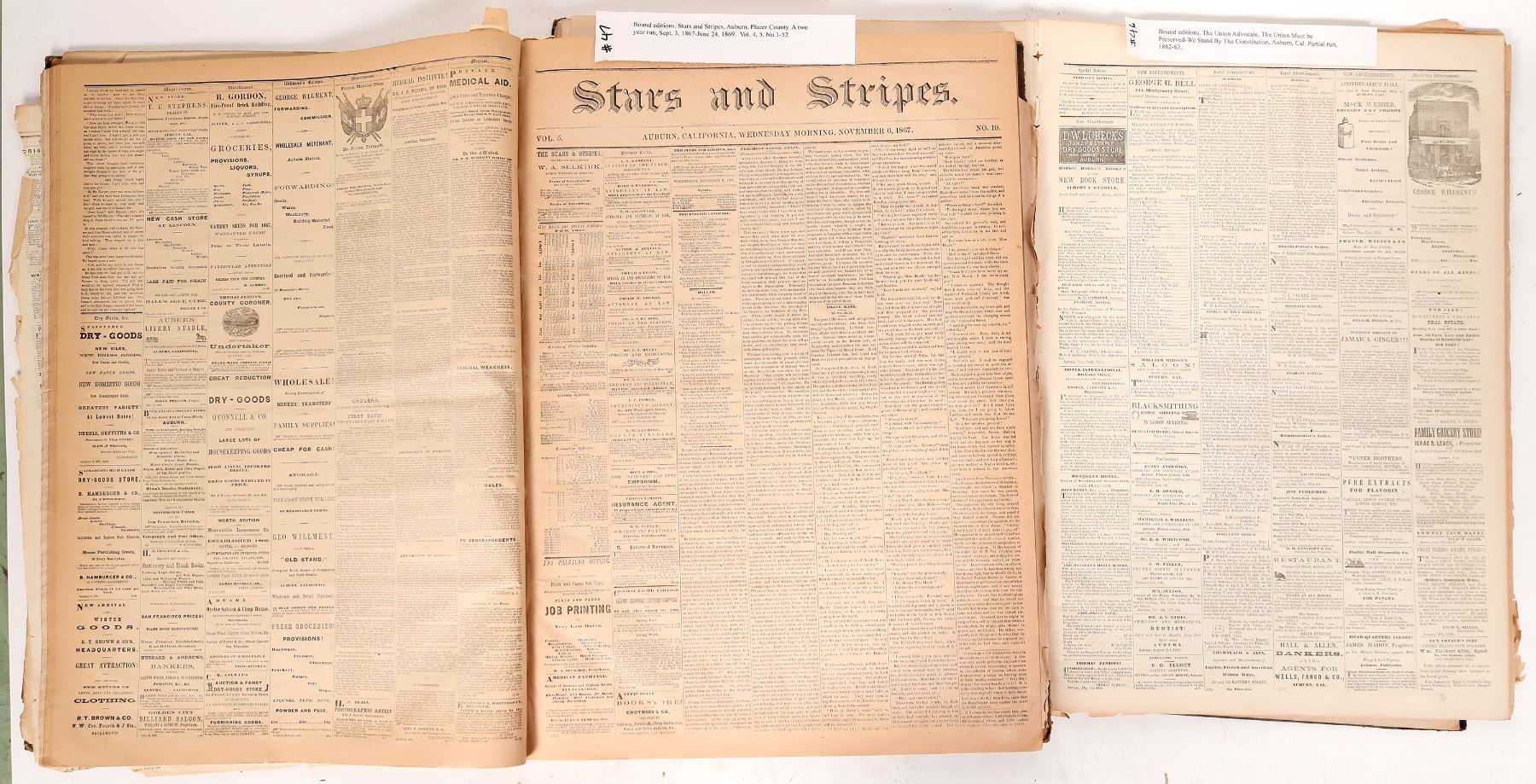 Three large bound volumes of three Placer County newspaper archives. This includes 1860 editions of The Placer Herald (1855-1991), The Union Advocate (186?-1???) These start with 1862 editions. Lastly, we have Stars and Stripes (1867-1872. The hardbound volumes need repair, but all the pages are intact. This is a time that the country was divided and the newspapers reflected that divide. Please see photos for more details. Auburn California
