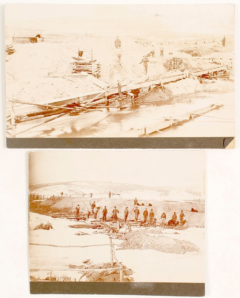 Although not identified these two mounted photos seem to be from the Anvil Creek, Nome area. Both show placer mining and placer miners. Contrast is good. Largest photo measures 4.5 x 7.75". THis is a ncie pair. Anvil Creek was the site of the 1898 gold discovery that triggered the Nome gold rush. HWAC# 62218 Date: Location: Nome, Alaska