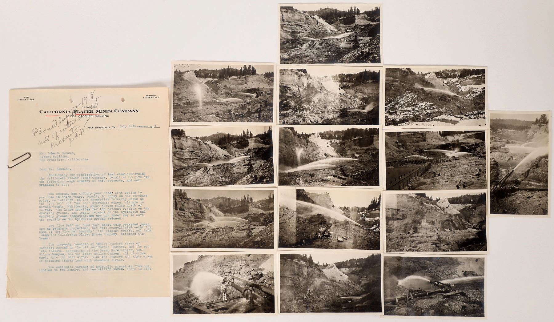 A group of 14 photos showing placer mining in Nevada County, California accompanied by a letter of proposal from The California Placer Mines Company to one John B. Newon of San Francisco asking that his company take over placer mining operations. The letter is typed,