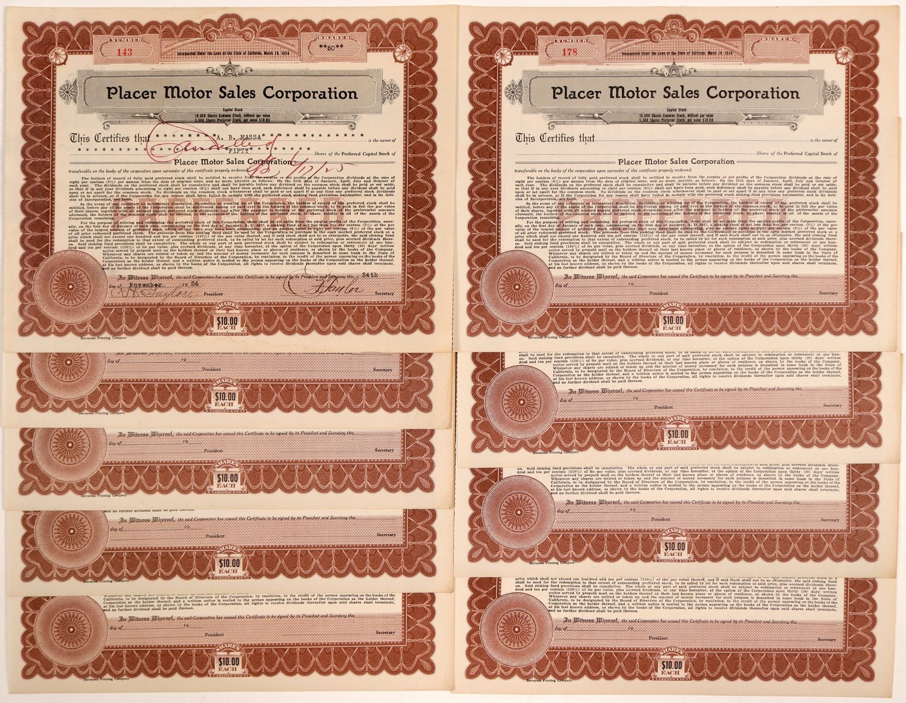 Lot of 9: one issued in 1924 and 8 unissued. All have a brown border, black print. 8.5 x 11" This was a Ford dealer in Auburn, CA, according to newspaper ads found.