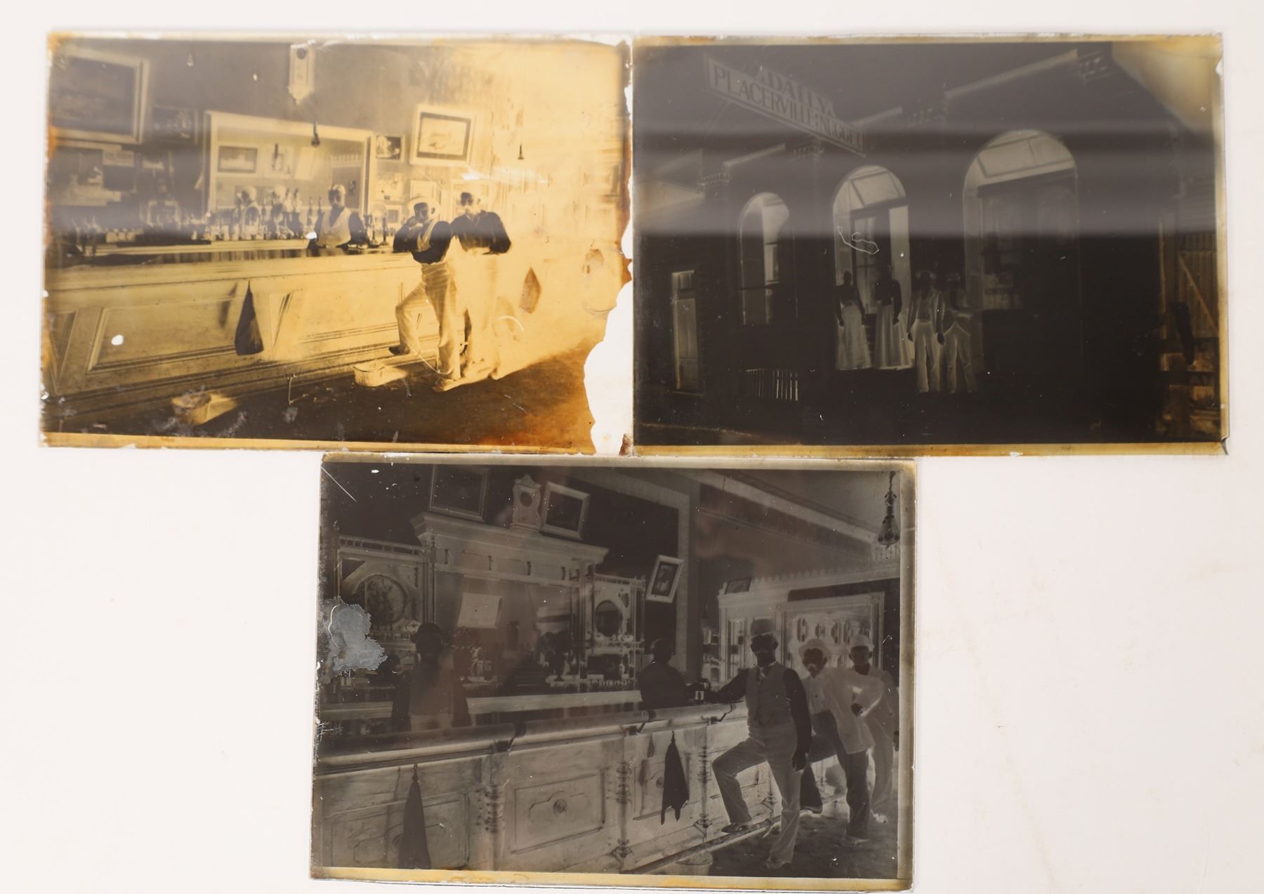 Placerville glass negatives (3). First is a photo of The Daily Nugget, a newspaper that I can find no information about and since I worked for The Mountain Democrat, also in Placerville, that's saying something. There are also two other 5"x 7" plates, showing the interiors of a couple of drinking parlors. One could be "The Cary House." Beautiful and historic. Please see photos for more detail. Placerville California