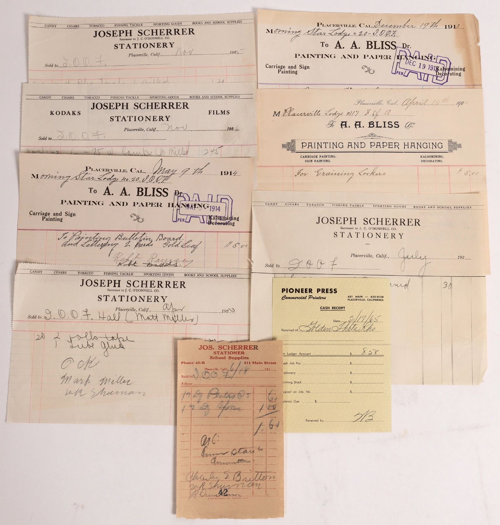 9 pieces. Find Bliss, Pioneer Press, Scherrer Stationary. 1900 - 1920's. United States of America California Placerville