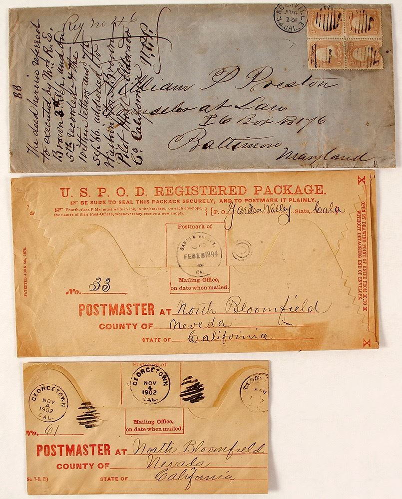 The premier piece in this lot is the Placerville 1866 legal sized envelope. Dated August 10, 1866 (date is derived from note). Inside was a deed from R. E. Brown for property in Pilot Hill, El Dorado, California. There was gold here, but not much else. A plate of four 1 cent stamps is tied to the cover. 2) Cut USPOD Registered Package. 1902 Georgetown. 3) February 16, 1894 Garden Valley on a USPOD Registered Package. Garden Valley was originally called Johntown in honor of the sailor who discovered gold at this site. The name was changed to Garden Valley in recognition that marketing vegetables was more lucrative than gold. (Potter Collection) Date: 1866 Location: Placerville, California HWAC# 571529