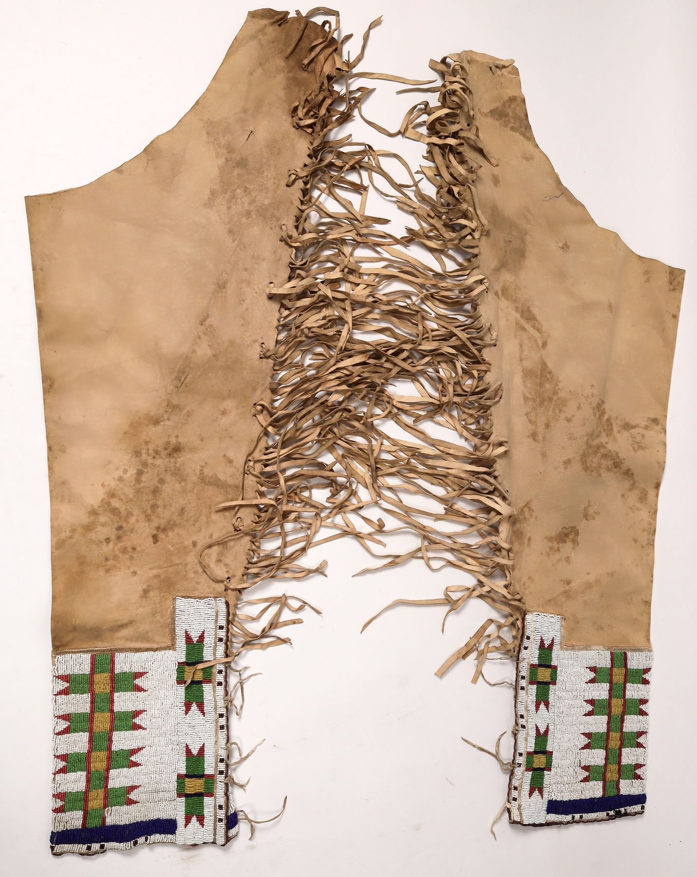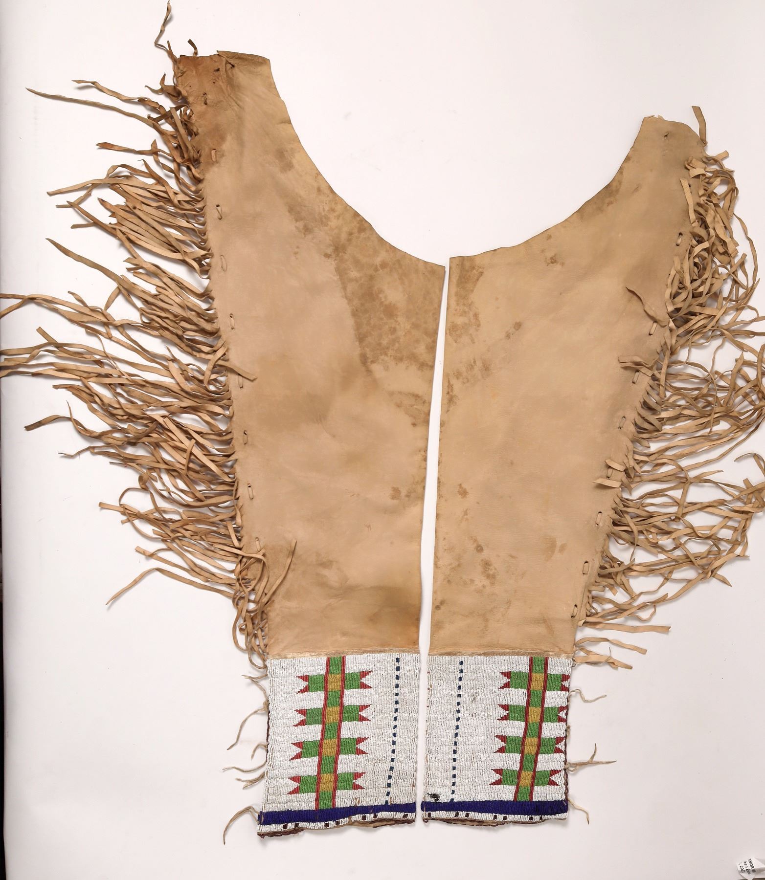 Vintage beaded leggings, probably Sioux. White background, design in green, yellow, red, dark blue--front and back sides. Beading is beautiful and intact. Hide leggings are fringed and approx. 27" from crotch to ankle. Worn, but in very good condition.