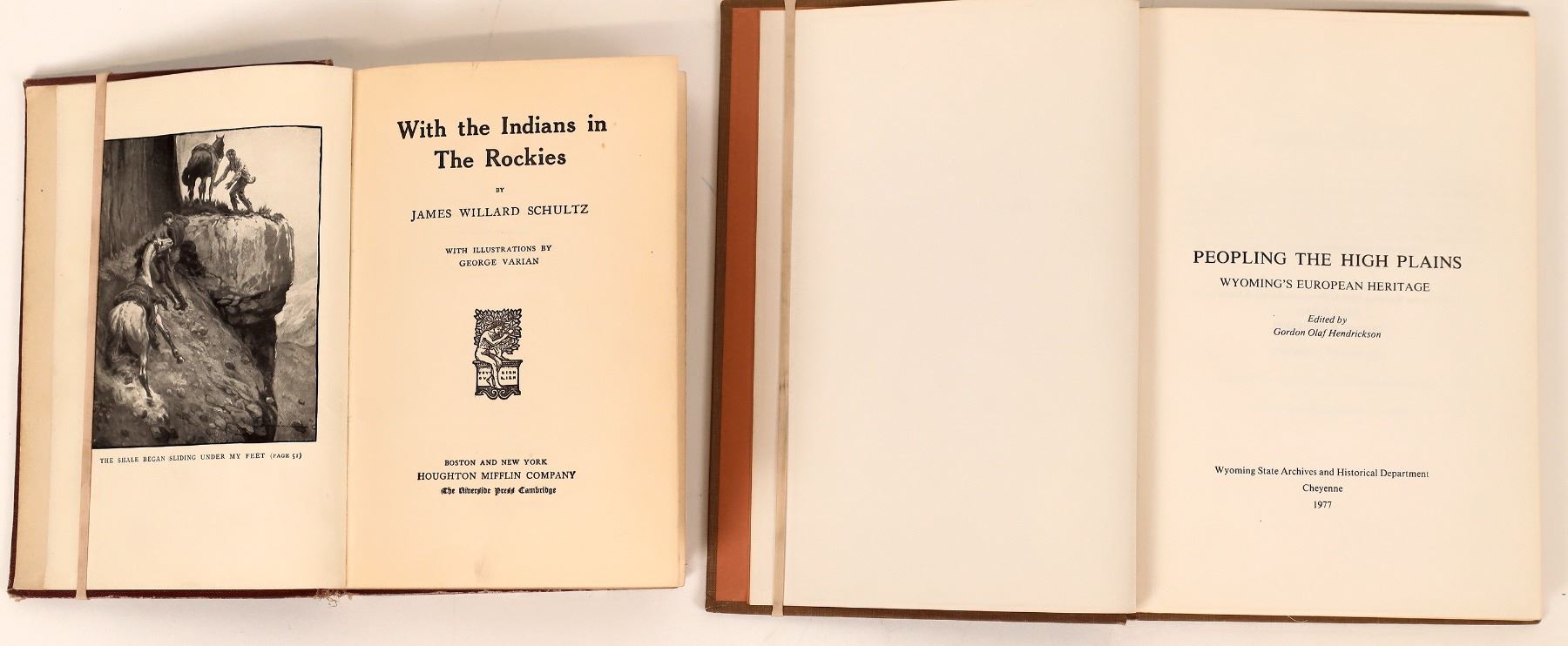 A duo of books dealing with American Indians in the Rockies. First is "With the Indians in the Rockies" by James Willard Schultz copyright 1912 , 227 pages. Binding shows slight separation. Next is "Peopling the High Plains" by Gordon Olaf Hendrickson, copyright 1977, 199 pages, in very nice condition. 1912 & 1977
