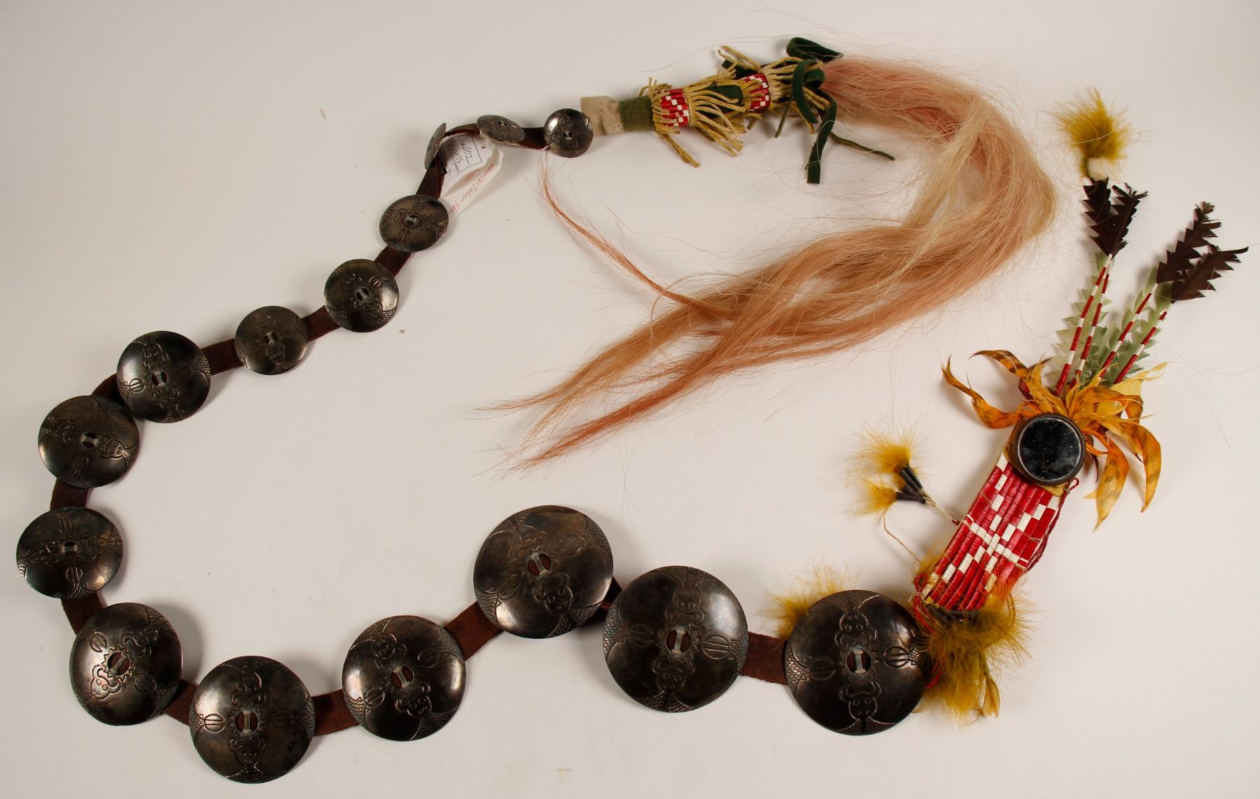This is an American Indian hair drop that measures about 8' in length. It is adorned with German silver conchos, porcupine quill accents, leather and horsehair extension. This appears to be from the early 20th century and is in immaculate condition.