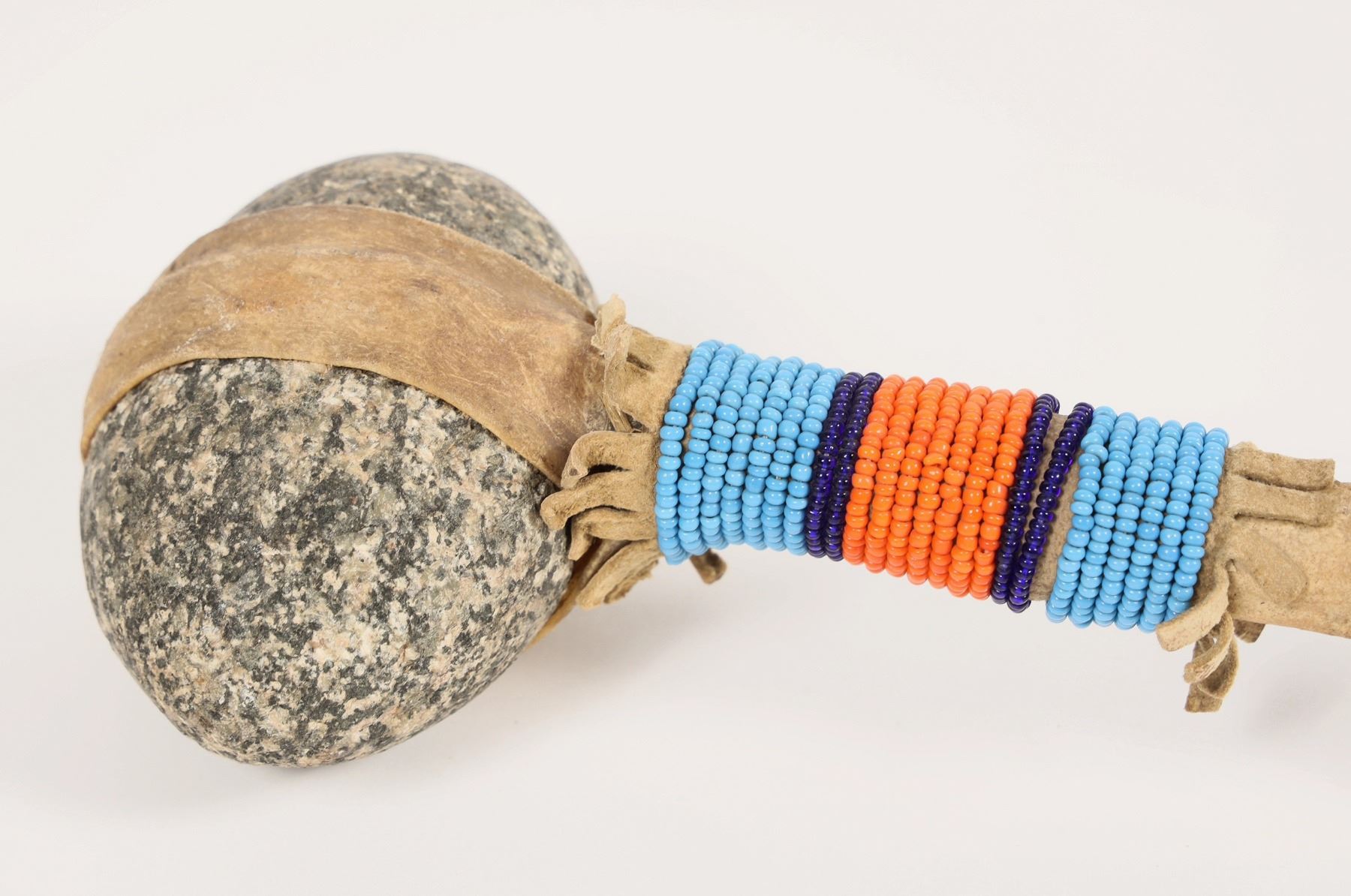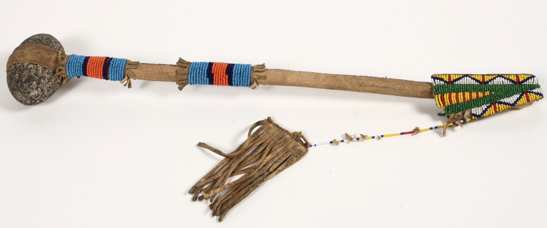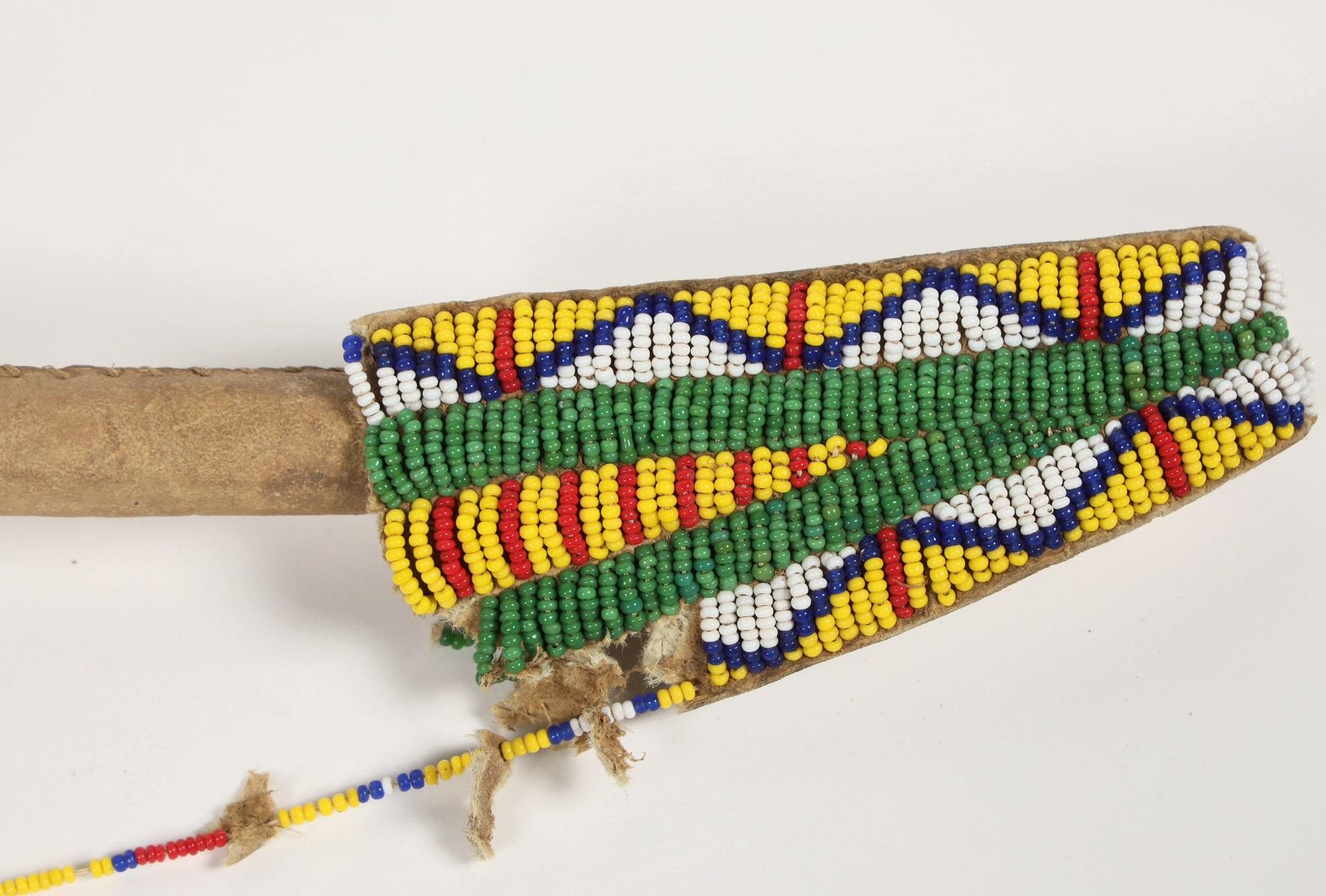 19" length 4 colored beaded handle with yellow and green beaded "drop". Damage to bottom of handle and to the drop. See photos.