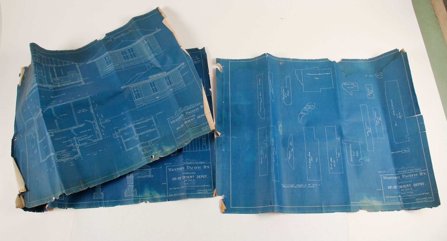 Three blueprints, 18 x 24" made for the Western Pacific Railway of a standard 20 x 32' Desert Depot. This standard plan was to be made for the stops between San Francisco and Salt Lake, thus the Nevada desert. These three blueprints include side views, plain view, details of footings, overall foundation construction and details of prominent structural support. Of interest is the layout of the office itself which had a telegraph office at front and center, conductors room at the right front of the building, three bedrooms and a kitchen. Extremely rare and very important as this is the blueprint for all of the small depot houses along the Western Pacific in the Nevada desert. Edge issues, please see photograph online.