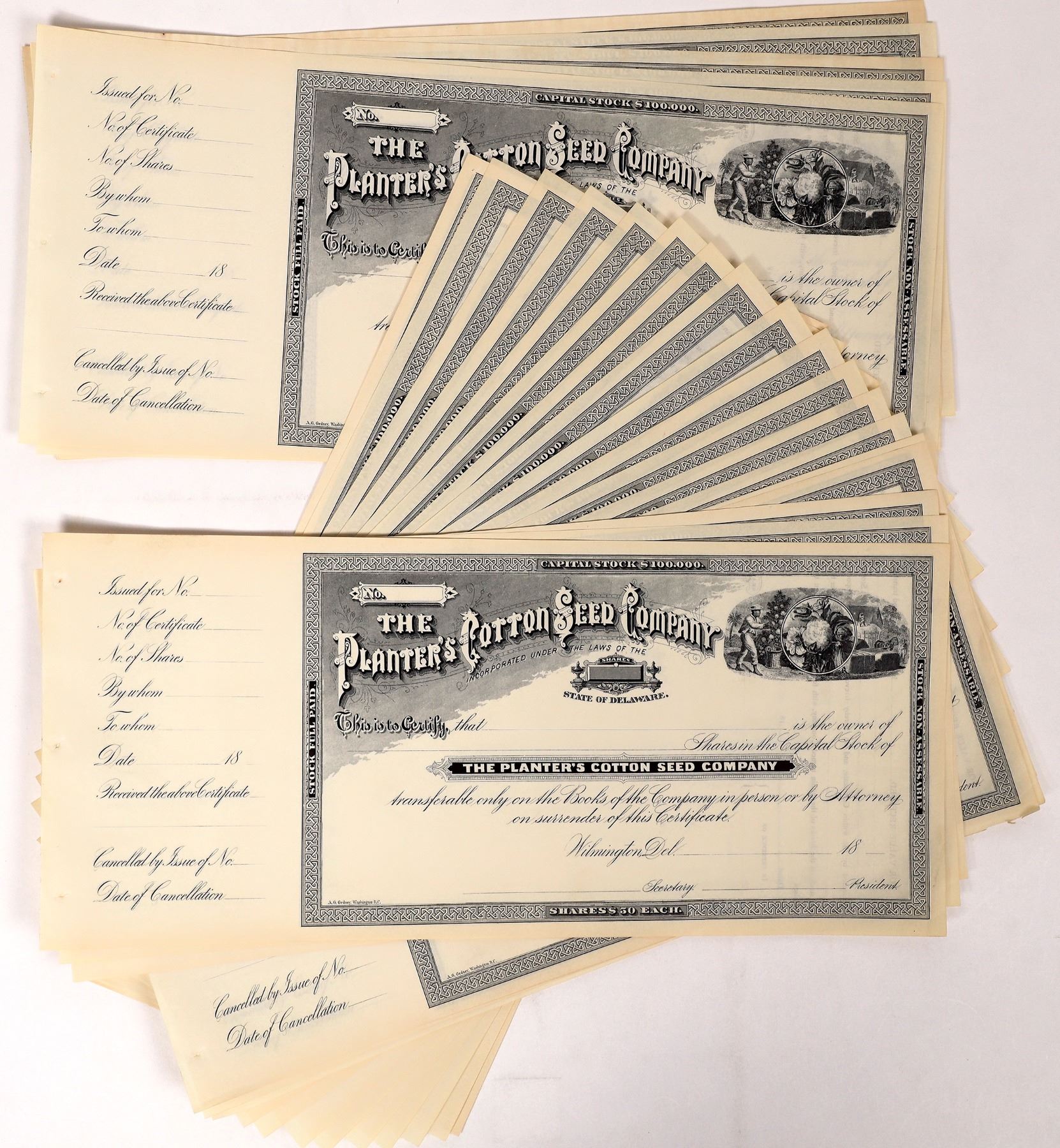 Lot of 30 unissued stocks. Inc. in Delaware. Fancy printed logo with vignette of African American picking cotton. Dateline Wilmington, Del., 18--. Printed by AG Gedney, Washington, DC. 6.5 x 15" This company was incorporated in 1885 to "manufacture meal, feed, oil, paper stock, and other products from cotton seed or other seed or grain..." Later newspaper articles seems to point to them operating in North Carolina, South Carolina, and Alabama.