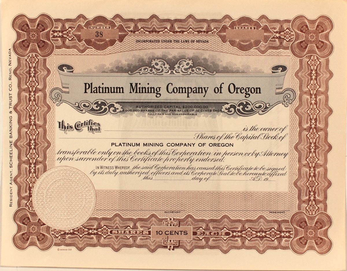 Stock certificate, uncancelled/ unissued, certificate #38. Ornate litho by Goes. The Resident Agent is Scheeline Banking & Trust Co of Reno. Excellent condition. Platinum stocks are very rare. City: State: Oregon Date: c.1920 hwac# 20323