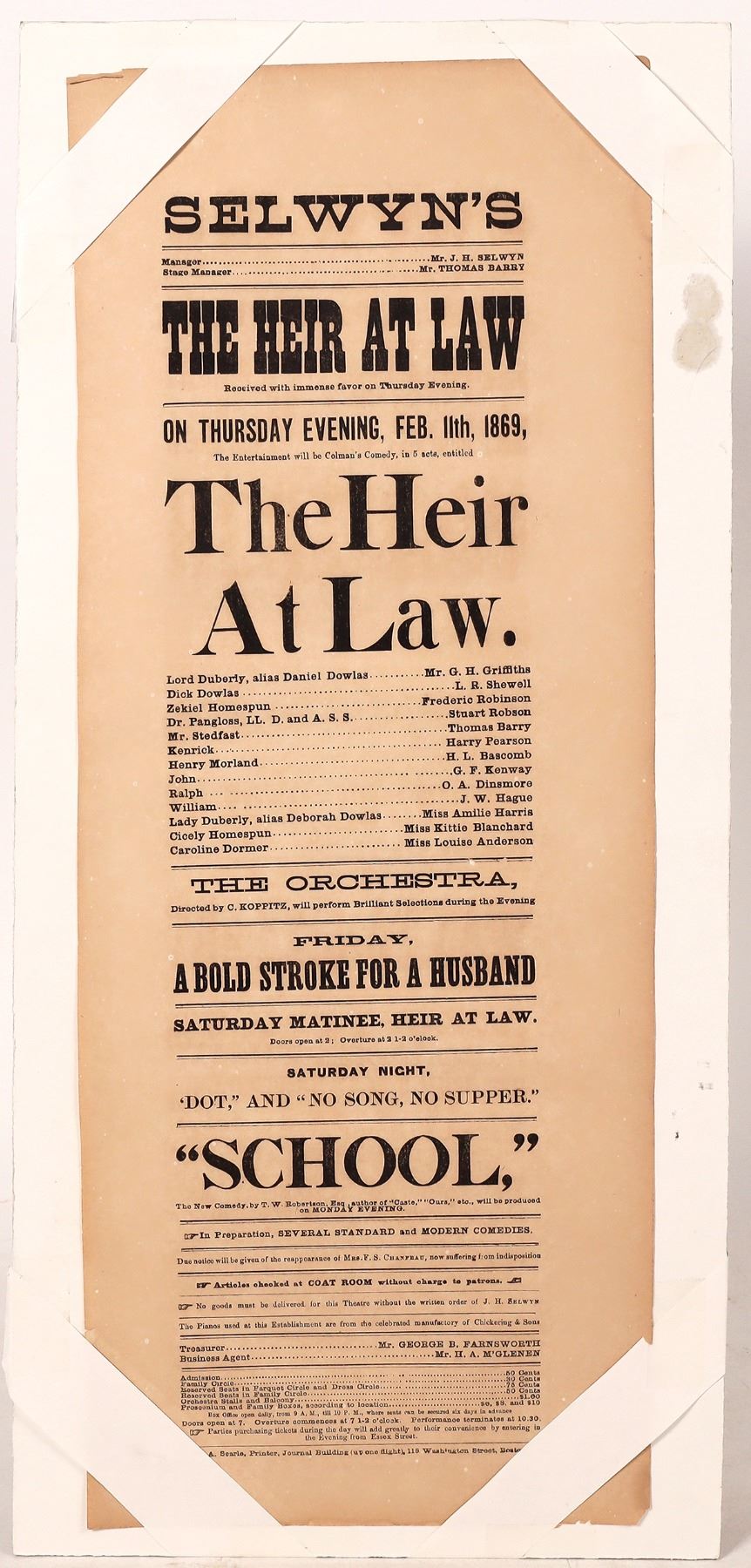 Broadside from 1869 advertising the play The Heir At Law written by George Coleman the Younger in 1797, at the Selwyn Theatre in Boston on Thursday February 11. Also advertised is the play A Bold Stroke For a Husband, written in 1783 by Hannah Cowley & "School" by T.W. Robertson. The theatre was owned by John Selwyn from 1867-1870 & was later changed to the Globe Theatre. The broadside measures 7"x 20" & is on very nice condition, save for a corner cut & a tiny fray at the bottom right. Please see photos for more details._x005F_x000D_ [Boston Massachusetts