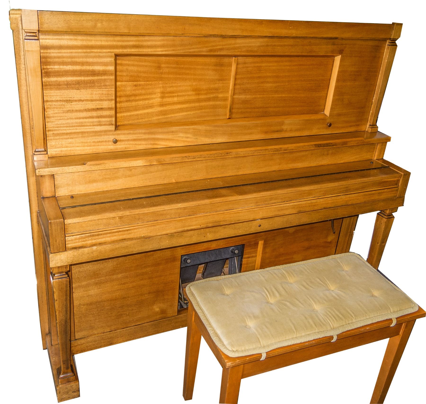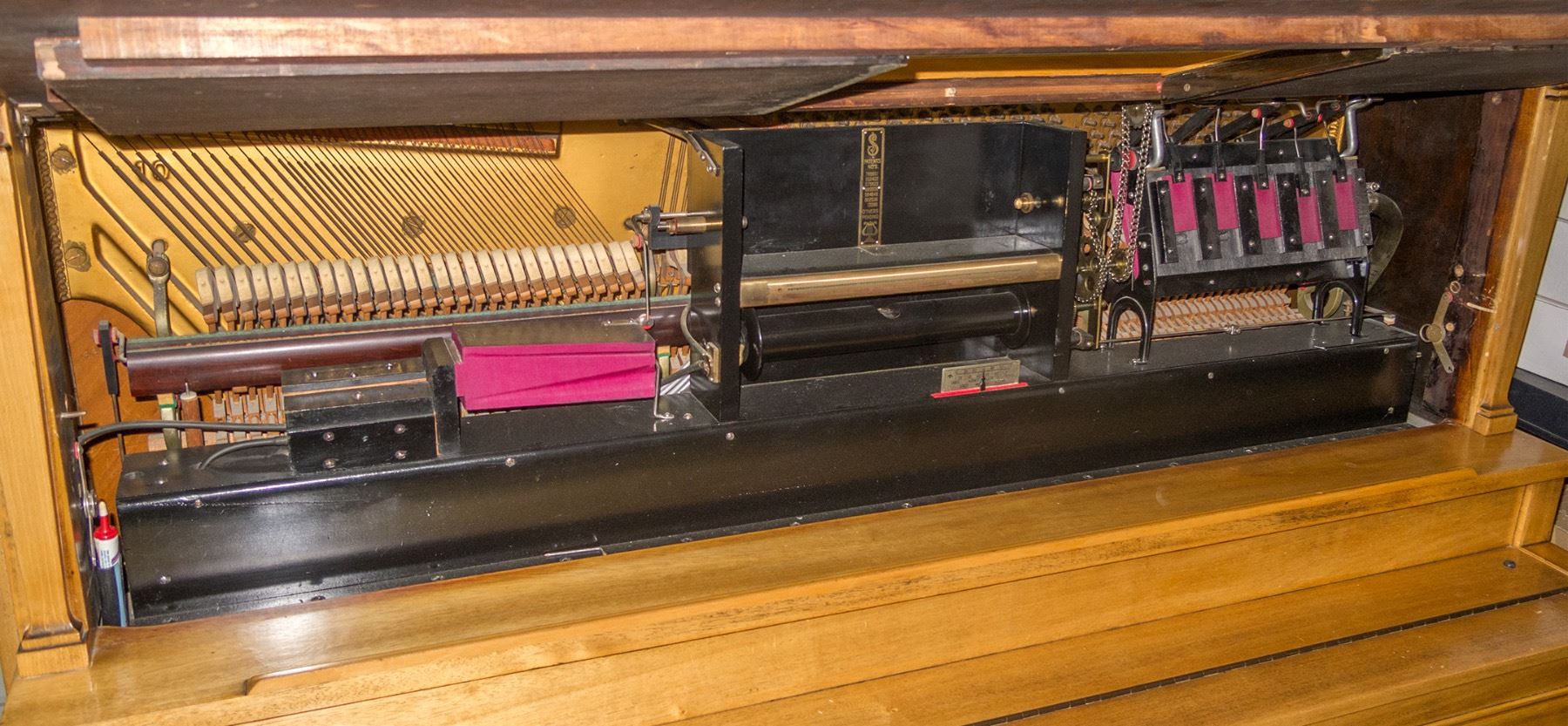 Mason Player Piano, beautifully refinished with light color finish. Stool, and 300 music rolls. The Mason upright was a standard player piano in early honky-tonk bars and saloons. The music rolls attest to this, with many jazz, blues and ragtime tunes. Of the approximate 300 rolls, a number of them were purchased by the owner from the Los Angeles area restoration company in the 1970's and are probably not original to the date of the piano. 54" high, 59" long, 29" deep, with stool. The piano was fully restored in 1976 by Carty Piano in Torrance, Cal. From the Patrick estate. State: Nevada City: Goldfield/Reno HWAC#: 49207 Date: