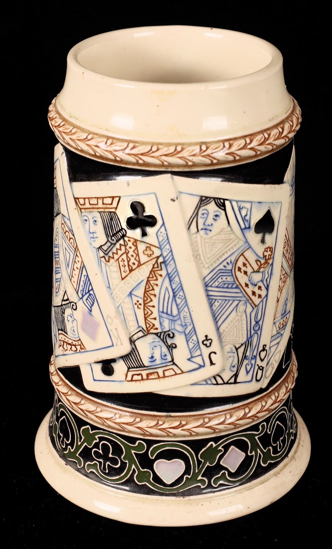 Spectacular fired pre Prohibition beer stein with 4 playing cards with pairs of kings and queens. 0.5L. Made in Germany, 6" tall. No apparent chips or cracks. No lid. Milwaukee Wisconsin