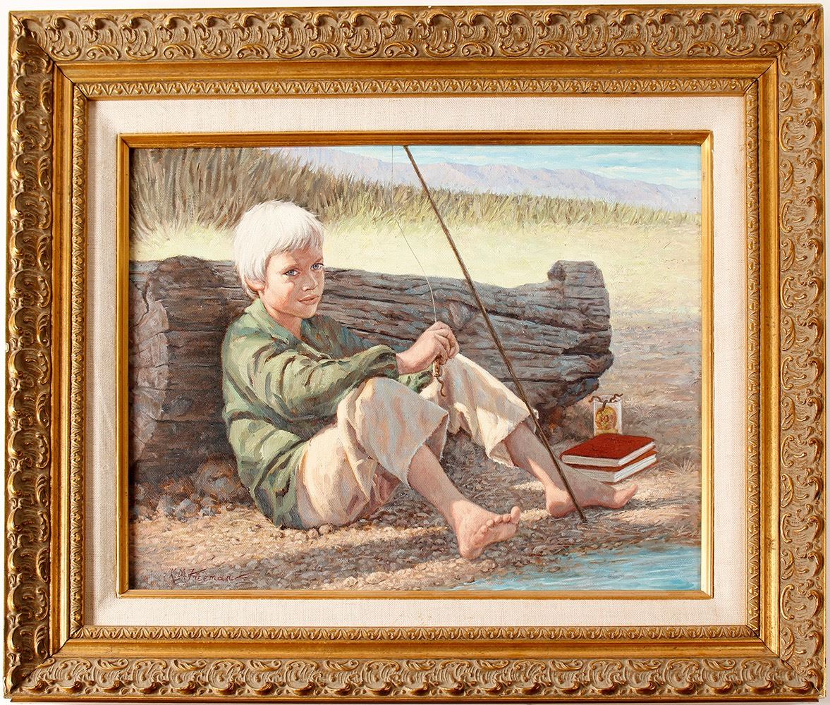 Kenneth Freeman (1935-2008) "Playing Hookie" oil on canvas. Signed K. M. Freeman. 11.75" x 15.5", framed, 18" x 21.5". Freeman's interest was in portraits and subjects of the West. John Singer Sargent has always been his idol as a portrait artist, and Ken has maintained a portrait style in all his art forms including oil, bronze. His models are unanimously impressed by his ability to capture on canvas that essence of humanity. Date: Location: HWAC# 57805