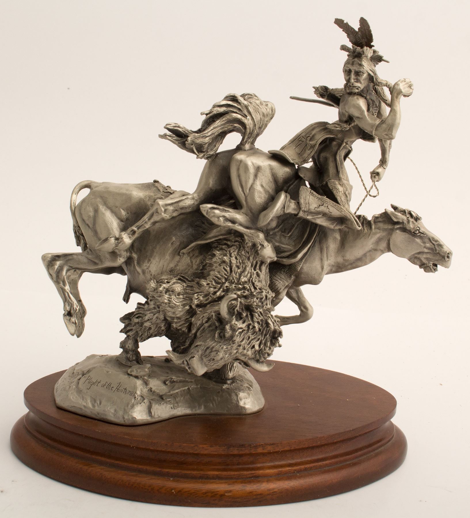 "Plight of the Huntsman" by Michael Boyett. Pewter sculpture, # 93 / 950. 6.75" x 7" x 3". Incredible scene of hunter and his horse jumping over a buffalo. State: Texas City: HWAC#: 48151 Date: 1981