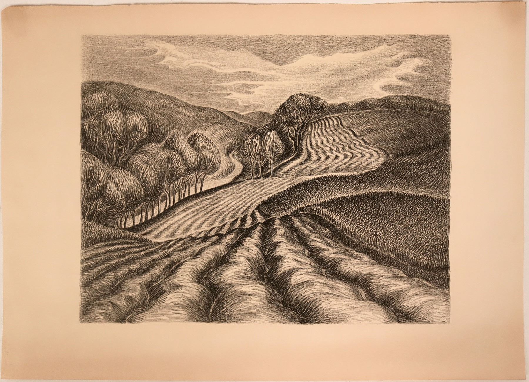 This lithograph is titled "Ploughed Fields" by Wanda Gag part of the American Artist Group print series of 1936. Unsigned, with AMAG logo on the back. Roughly 11.5 in. X 15 .75 in. ( 22.4 cm X 28.5 cm). Wide border with tape marks on two corners not visible from the front. Please see photos for more detail.